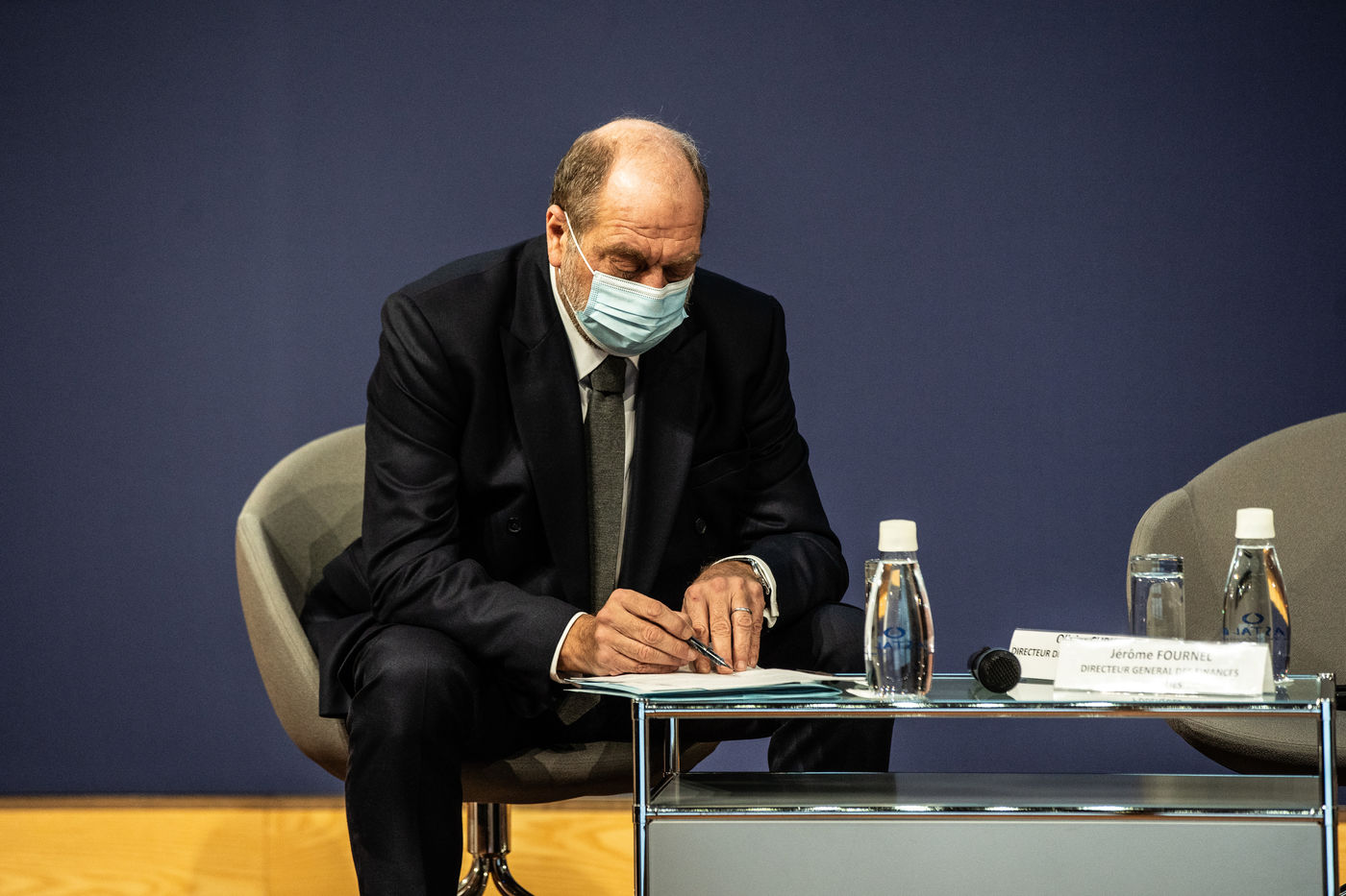 Ouverture de la journée de travail sur le thème « Lutter ensemble contre les fraudes », le mardi 30 novembre 2021, à Bercy. Discours d'ouverture par le garde des Sceaux, ministre de la Justice et du ministre délégué charge des Comptes publics, dans le Centre de conférence Pierre Mendès-France.