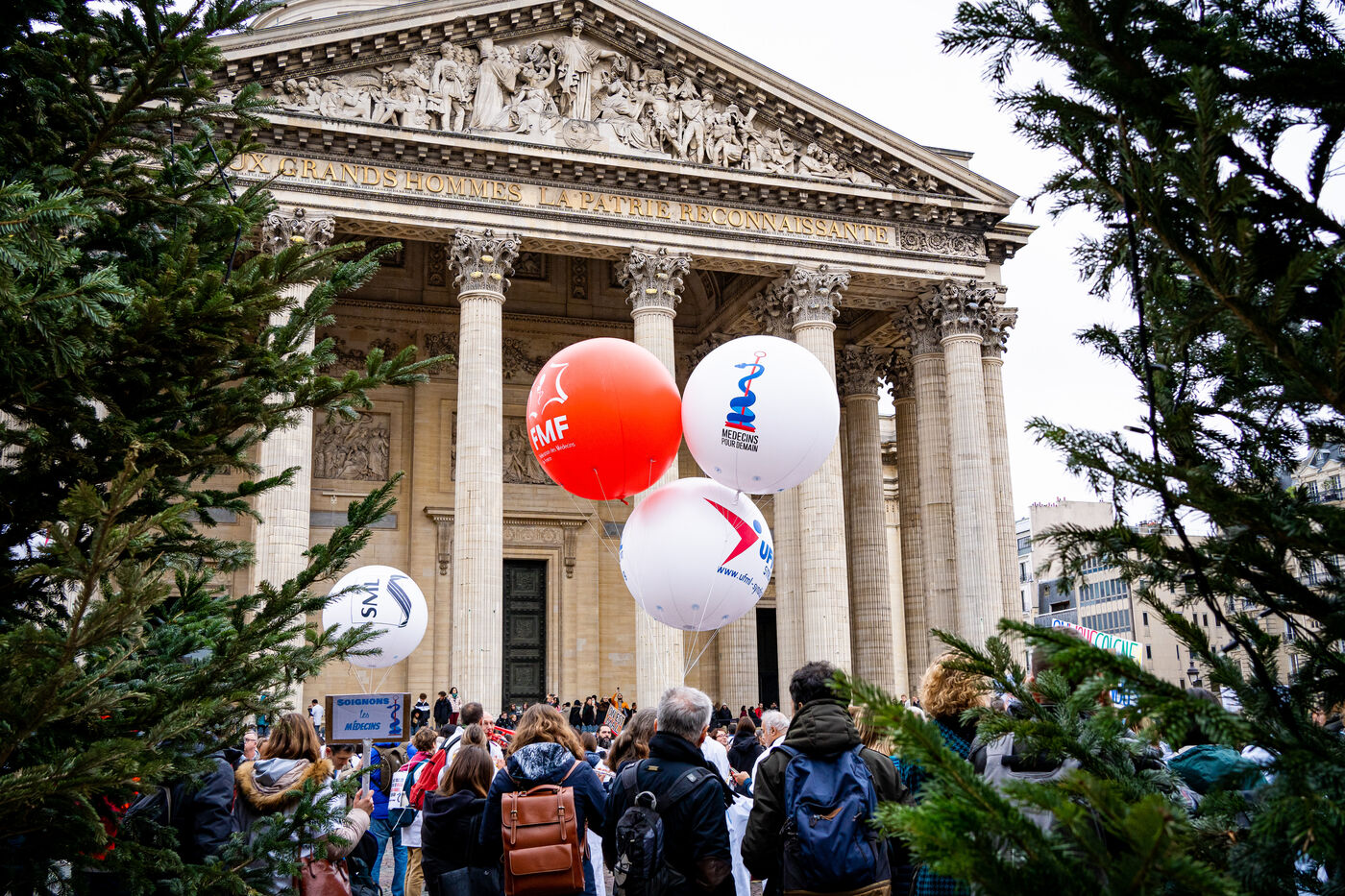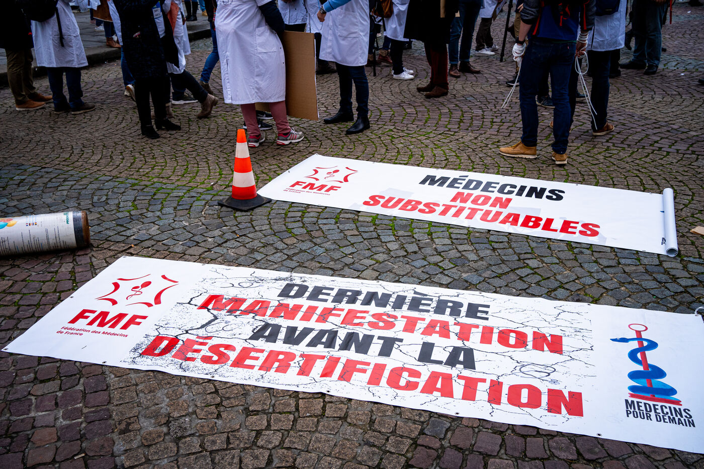 Journée de grève et manifestation nationale à Paris des médecins libéraux au départ de la Place du Panthéon. Manifestation organisée par le collectif "Médecins pour demain", soutenu par plusieurs syndicats (FMF, UFML, SML et Jeunes Médecins). La revendication centrale du collectif est le doublement du tarif de base de consultation c (de 25 à 50 euros), slogan le C=50 vu sur de nombreuses pancartes et banderoles. Jeudi 05 Janvier 2023.