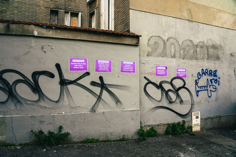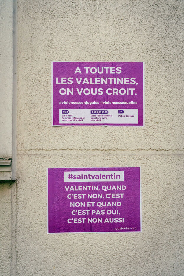 Collages of the feminist collective Nous Toutes #NousToutes on walls in the 20th arrondissement of Paris on the occasion of Valentine's Day which takes place on Tuesday, February 14, 2023, to celebrate Valentine's Day in a committed way in solidarity with women victims.