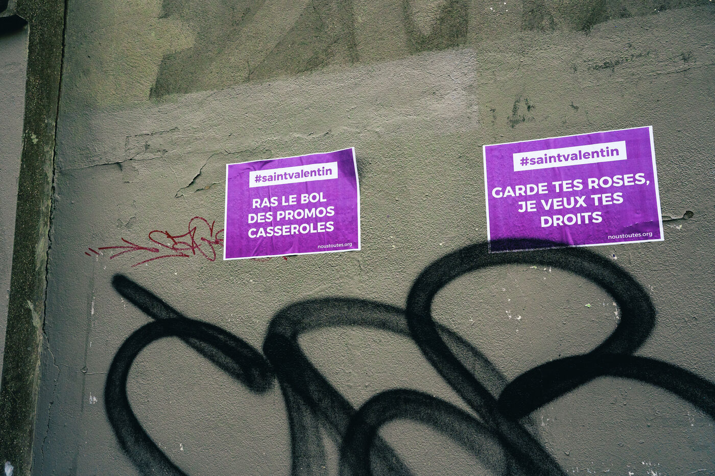 Collages du collectif féministe Nous Toutes #NousToutes sur des murs dans le 20e arrondissement de Paris à l'occasion de la Saint-Valentin qui a lieu le mardi 14 Février 2023, pour fêter la St Valentin de manière engagée en solidarité avec les femmes victimes.