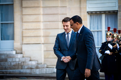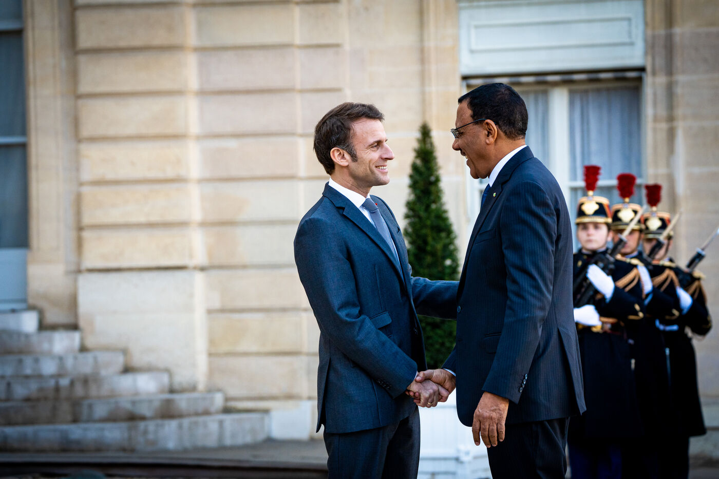 Reception in the main courtyard of the Elysee Palace. Meeting of the President of the French Republic Emmanuel Macron with the President of the Republic of Niger Mohamed BAZOUM. Working lunch to discuss the Franco-Nigerian partnership in the fight against terrorism in the Sahel, developments in the security situation in the region, and bilateral cooperation between the two countries. Thursday, February 16, 2023.