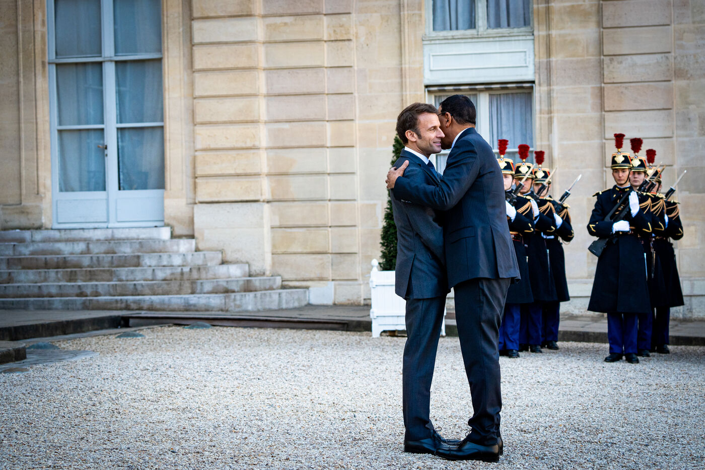 Accueil dans la cour d'honneur du Palais de l'Elysée. Entretien du Président de la République française Emmanuel Macron avec le Président de République du Niger Mohamed BAZOUM. Déjeuner de travail pour échanger sur le partenariat franco-nigérien dans la lutte contre le terrorisme au Sahel, l?évolution de la situation sécuritaire dans la région, et la coopération bilatérale entre les deux pays. Jeudi 16 Février 2023.