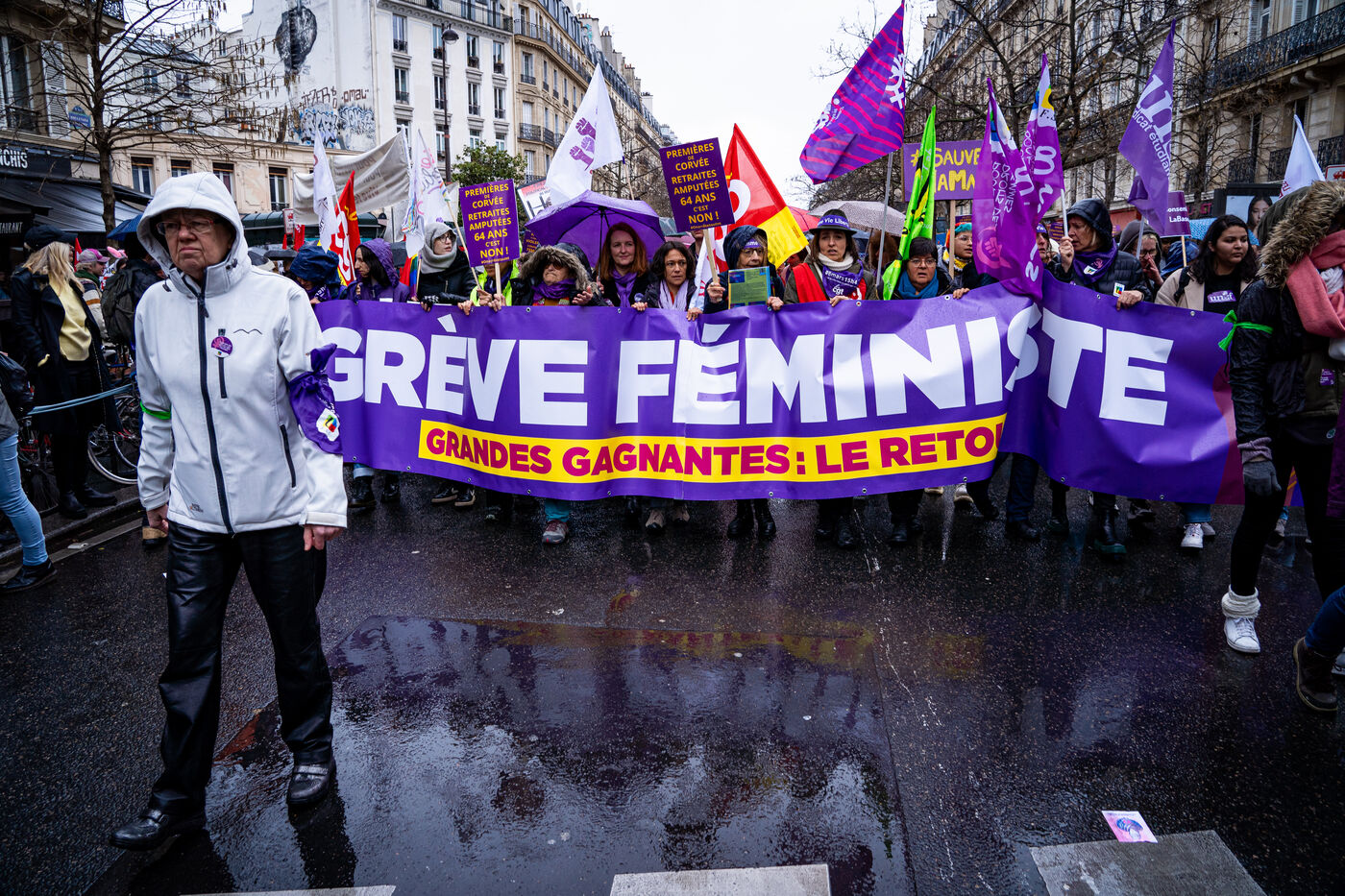 Manifestation féministe du 8 mars 2023 à Paris pour la journée internationale de lutte pour les droits des femmes. Contre le projet de réforme des retraites du gouvernement dont les femmes sont parmi les premières victimes. Mercredi 8 mars 2023.