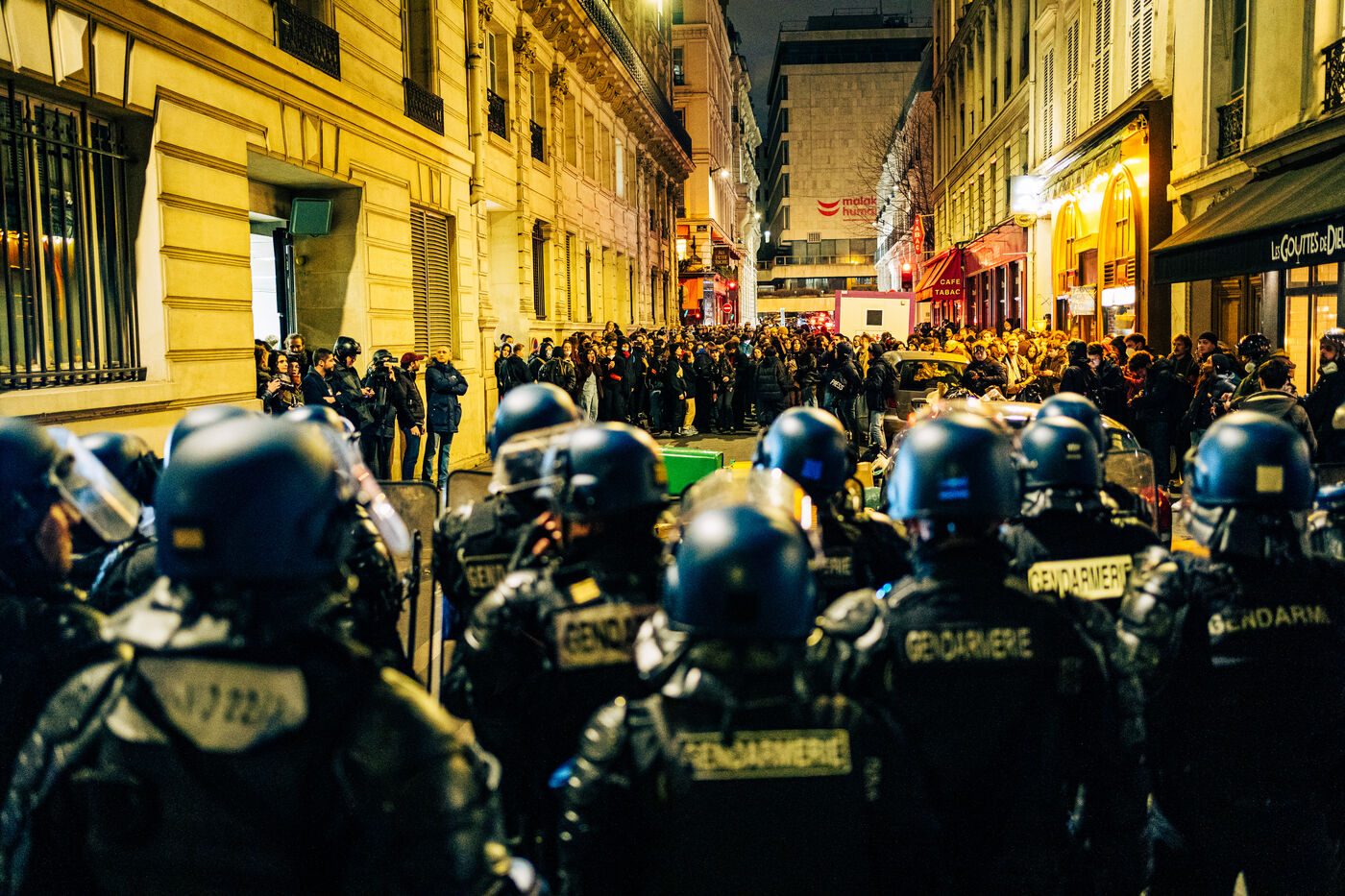 Manifestation au début déclarée et ensuite sauvage dans les rues du 18e et 9e arrondissements contre le projet de réforme des retraites et contre l'utilisation à l'assemblée nationale de l'article 49 alinéa 3 (49.3) par le gouvernement français et sa première ministre pour un passage en force de la réforme, processus jugé anti démocratique par les nombreux manifestants rassemblés, beaucoup de jeunes. Mercredi 22 mars 2023.