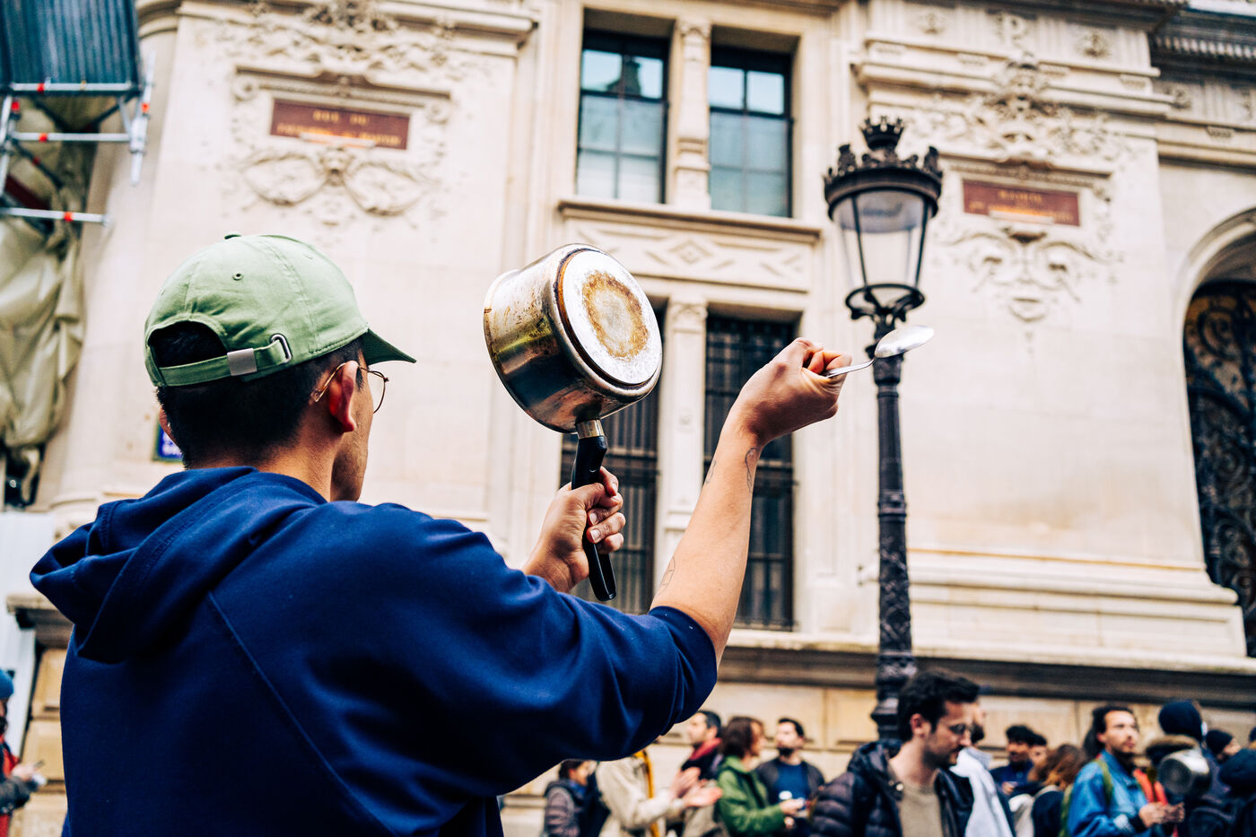 Gathering in front of the city hall of the 10th district of Paris to make noise at the time of the speech of the president of the republic (concert of pans, casserolade), then wild demonstration (spontaneous, not declared) in the streets of Paris. Demonstration against the reform of the pensions wanted by the government, with in particular the passage of the legal age of retirement to 64 years and the end of the special regimes. Monday, April 17, 2023.