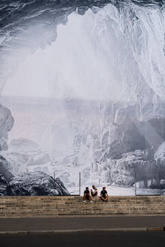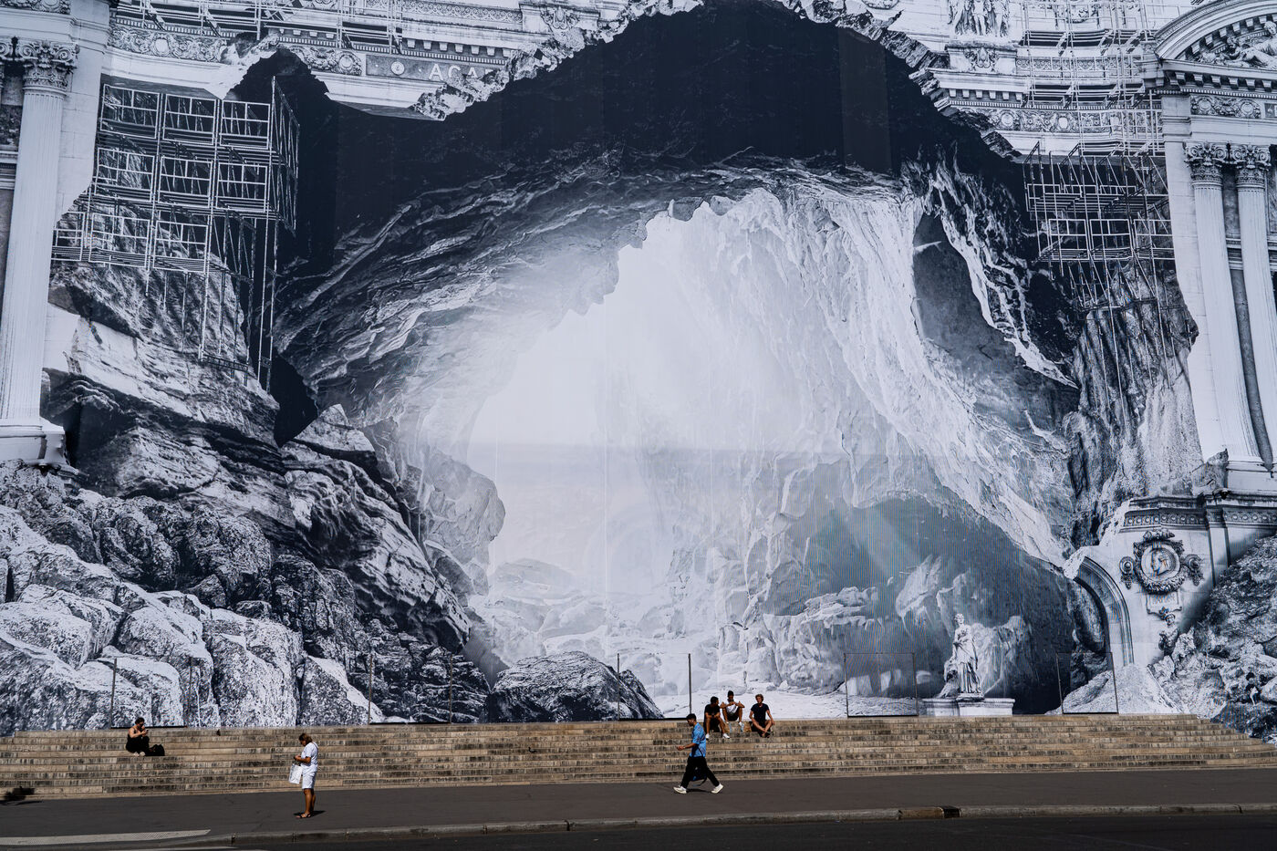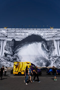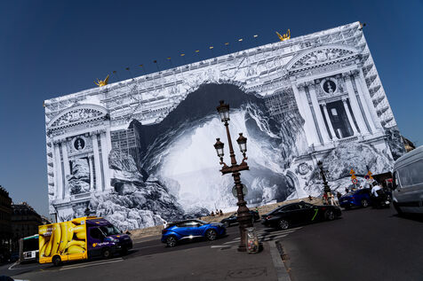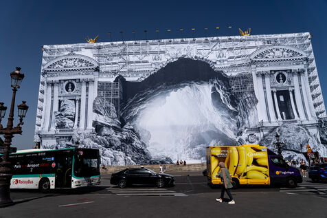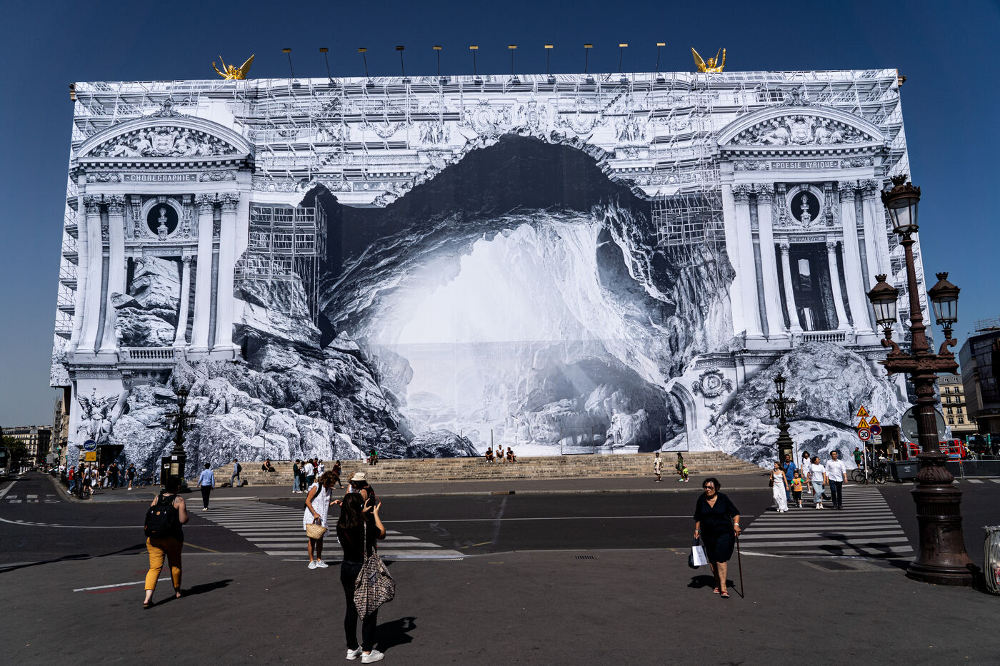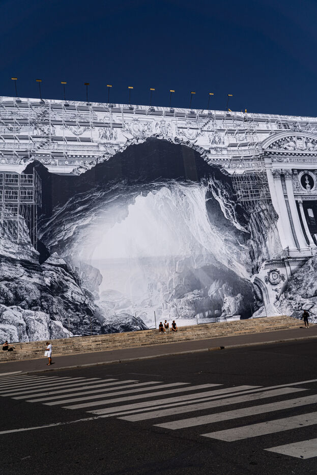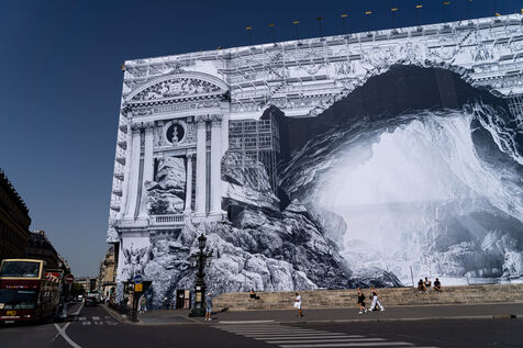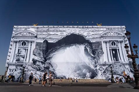RETURN TO THE CAVE - Act I - The entrance to the cave. As part of the restoration of the Palais Garnier, street artist JR (Jean René, contemporary artist) was invited by the Opéra national de Paris to dress the scaffolding covering the monument. From September 6 to 25, 2023, the façade of the Opéra, the temple of music and dance, will be transformed to reveal the entrance to an immense cavern opening onto a perspective of rock and light. Alluding to the romantic codes of the 19th century, but also to grand opera stage sets, the Napoleon III architectural elements seem caught in a double movement of time, ruin. A work in progress, as evidenced by the numerous scaffoldings present, a nod to the real and necessary work that physically supports this installation.