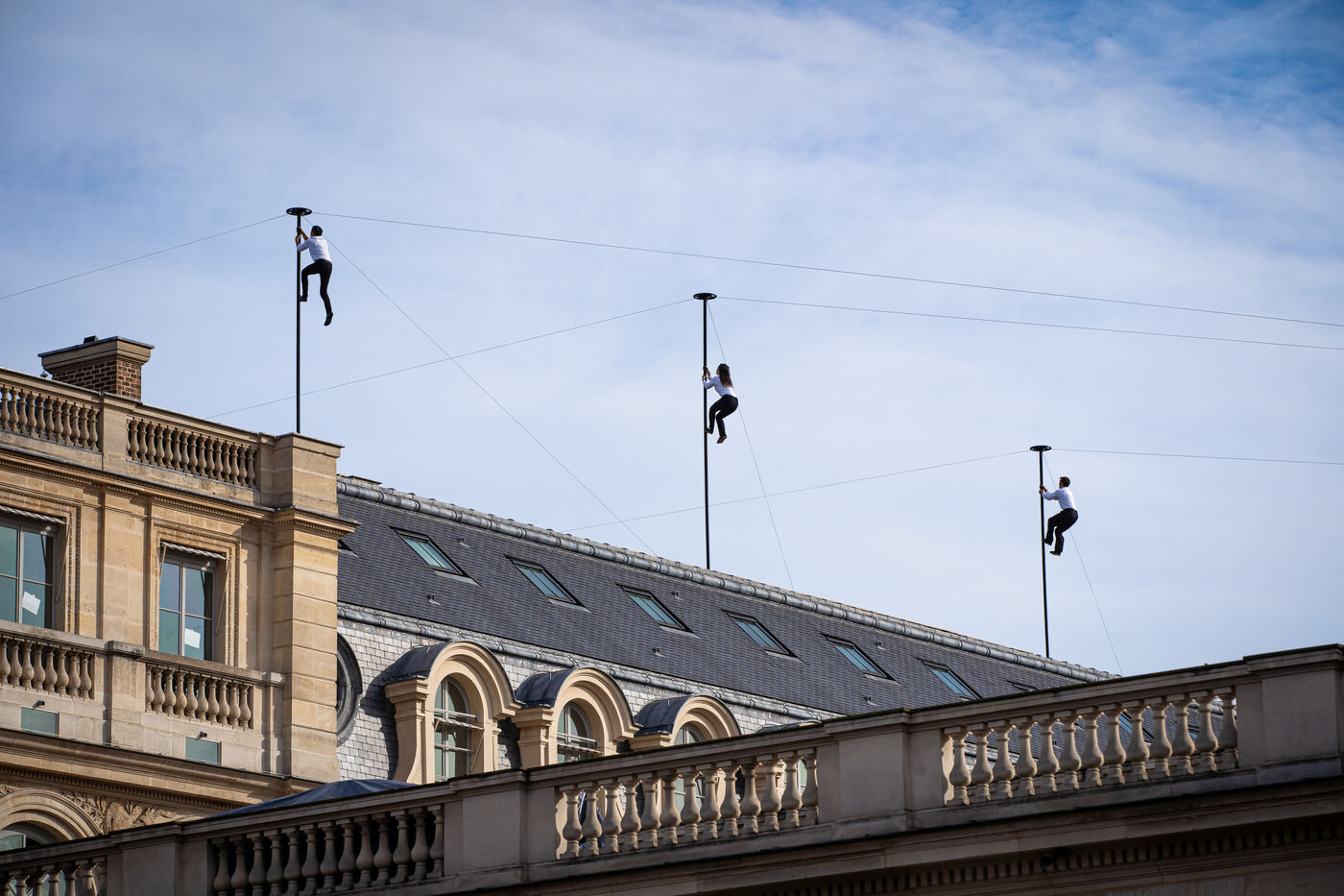 At the Palais Royal, Compagnie l'Oubliée's acrobatic show Horizon takes over the roofs and terraces of the Cour d'Honneur for an extraordinary spectacle. On the occasion of the Cultural Olympiad (part of the Olympic Games JO PARIS 2024) and the European Heritage Days, the show sold out several hours in advance. Many people were only able to catch a glimpse of the acrobats from the gardens. Sunday, September 17, 2023.