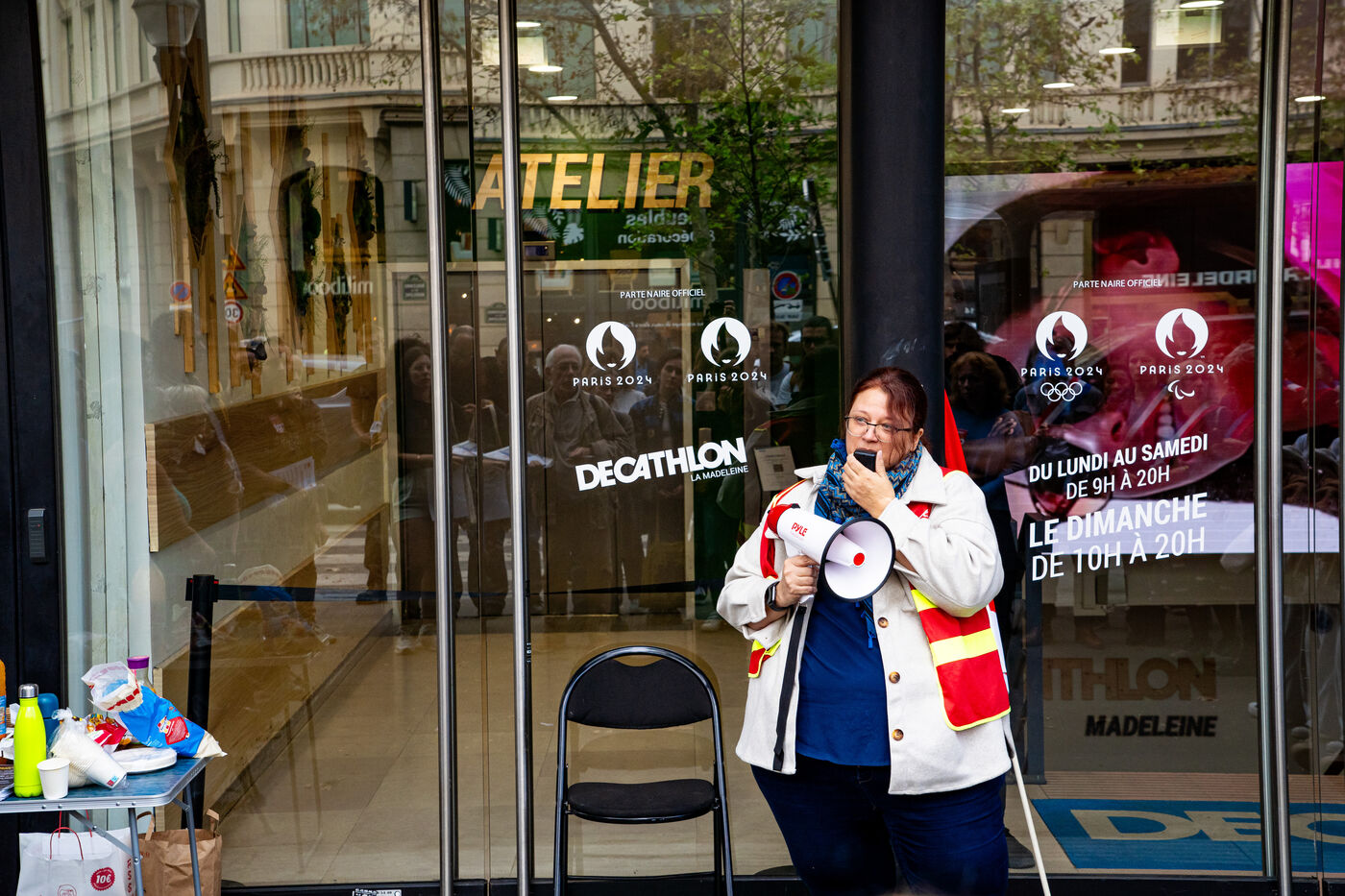 Rassemblement et piquet de grève devant le magasin Decathlon Paris La Madeleine suite à la mort d'un jeune intérimaire, accident du travail avec un chariot élévateur son premier jour de mission le mercredi 11 octobre. Elus de gauche, syndicats, personnel, collègues, délégués syndicaux dénonçaient depuis des années la pénibilité de leurs conditions de travail. Vendredi 13 Octobre 2023.