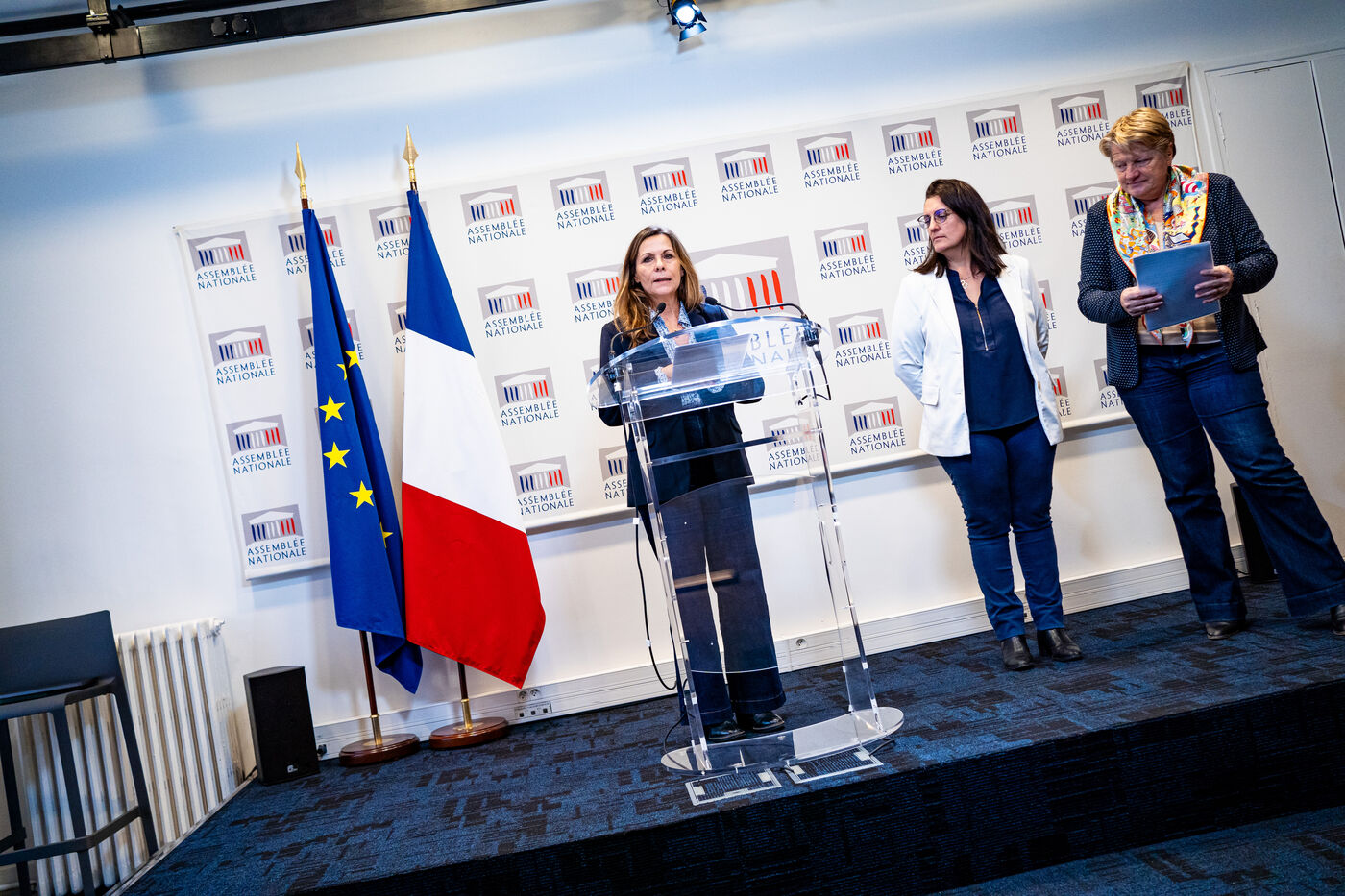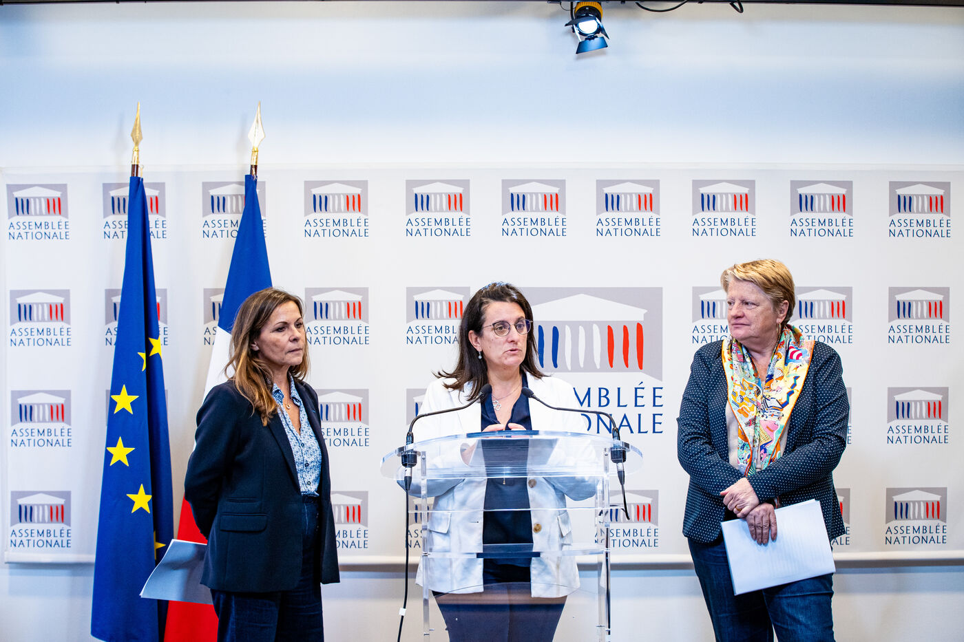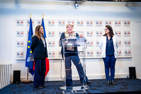 Presentation by deputies Perrine Goulet (Democrat Modem and Independents, Dem), Michèle Peyron (Renaissance, Presidential Majority, RE) and Isabelle Santiago (Socialist, SOC, Left), rapporteurs, of the report by the French Delegation for Children's Rights on the outlook for childcare in daycare centers. Topics covered: parental leave, neuroscience for the study of child development. Press conference at the French National Assembly, Paris, Tuesday November 14, 2023.