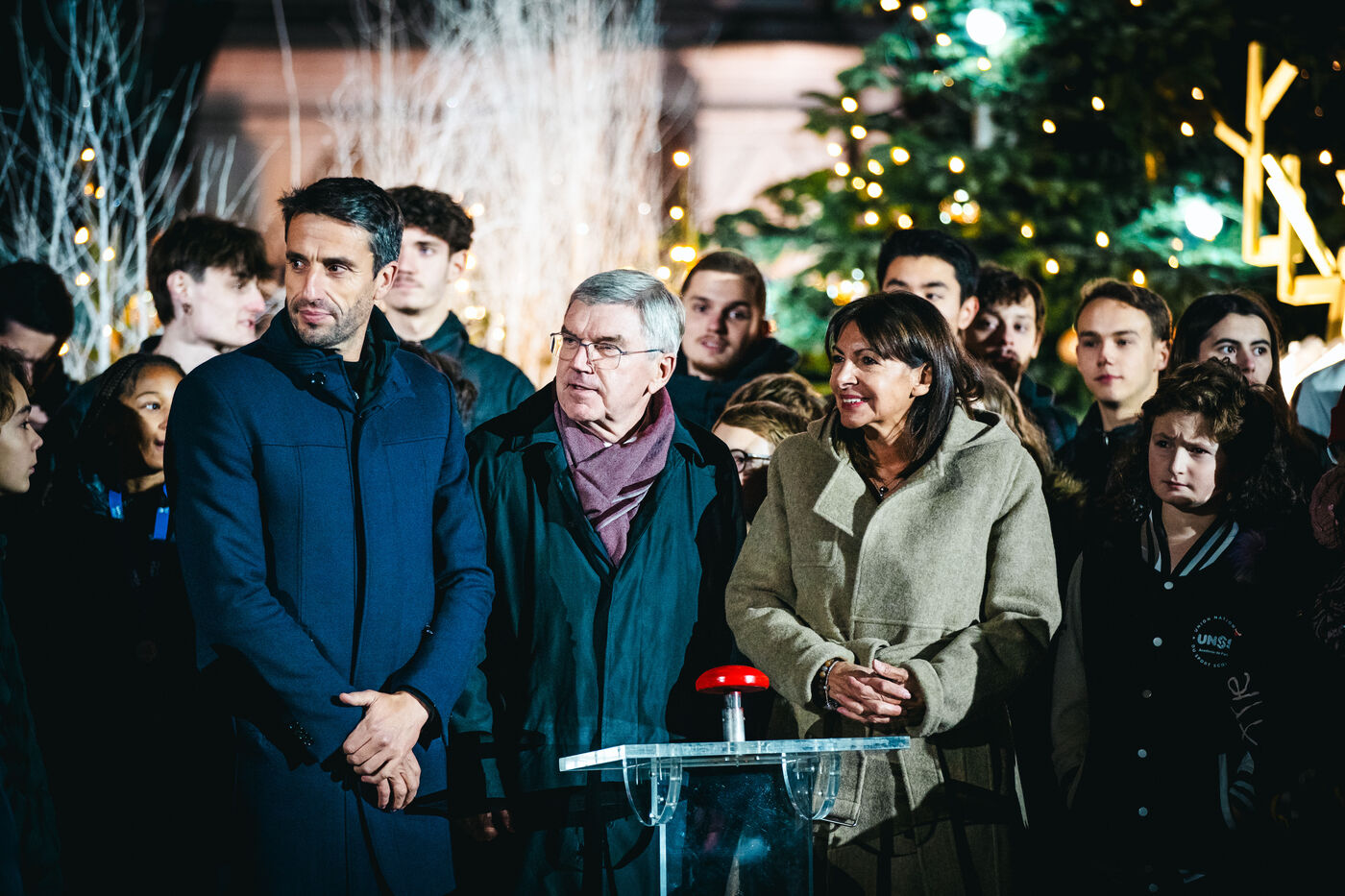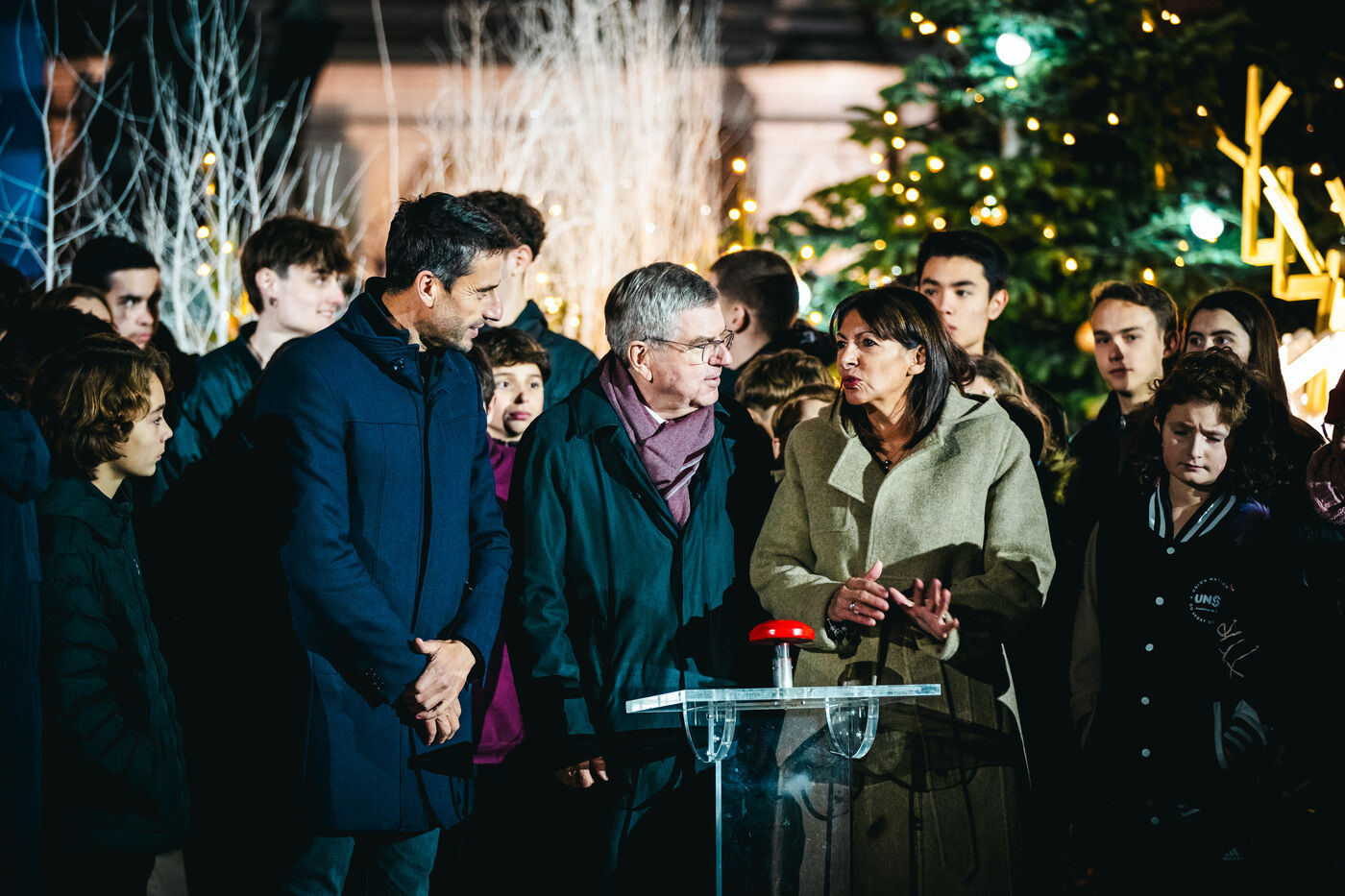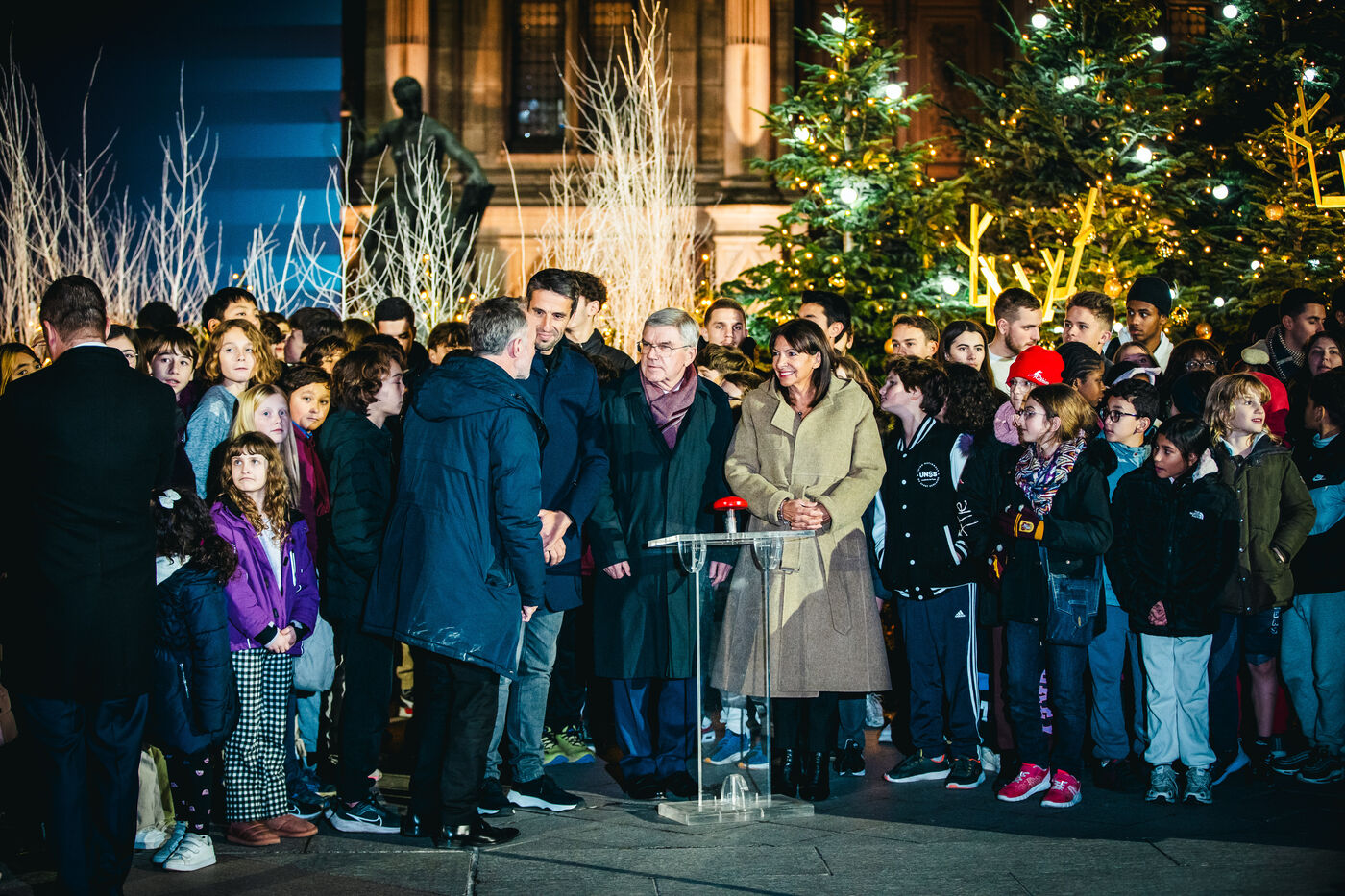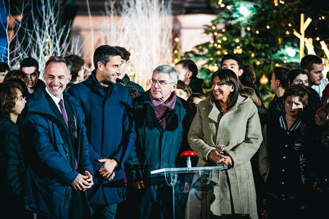 L'Hôtel de Ville de Paris s'habille aux couleurs des Jeux Olympiques et Paralympiques d'été de 2024 (JOP PARIS 2024). Inauguration du look créé pour les JO par la maire de Paris Anne Hidalgo. En présence de Thomas Bach, Président du Comité International Olympique (CIO), de Andrew Parsons, Président du Comité International Paralympique (IPC) et de Tony Estanguet, Président du Comité d?organisation. Mardi 28 Novembre 2023.