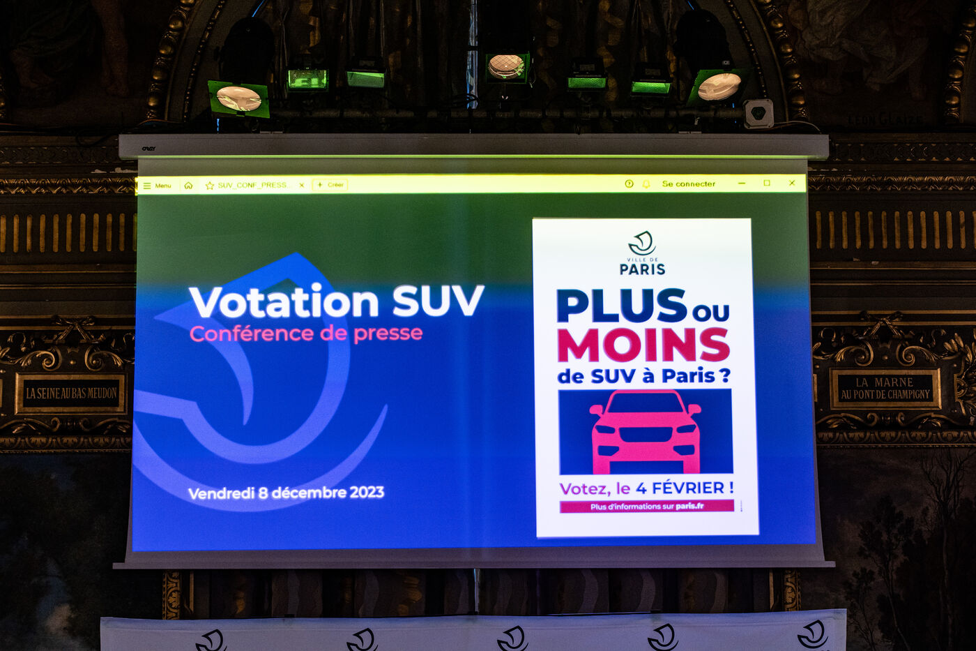 La Ville de Paris dévoile les détails de la votation citoyenne sur la place des SUV à Paris, vote prévu le 4 Février 2024. Conférence de presse de la maire de Paris et d'adjoints à l'Hôtel de Ville. La question posée sera : Pour ou contre la création d'un tarif spécifique pour le stationnement des voitures individuelles lourdes encombrantes et polluantes (justice sociale, lutte contre la pollution...). Vendredi 8 Décembre 2023.