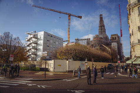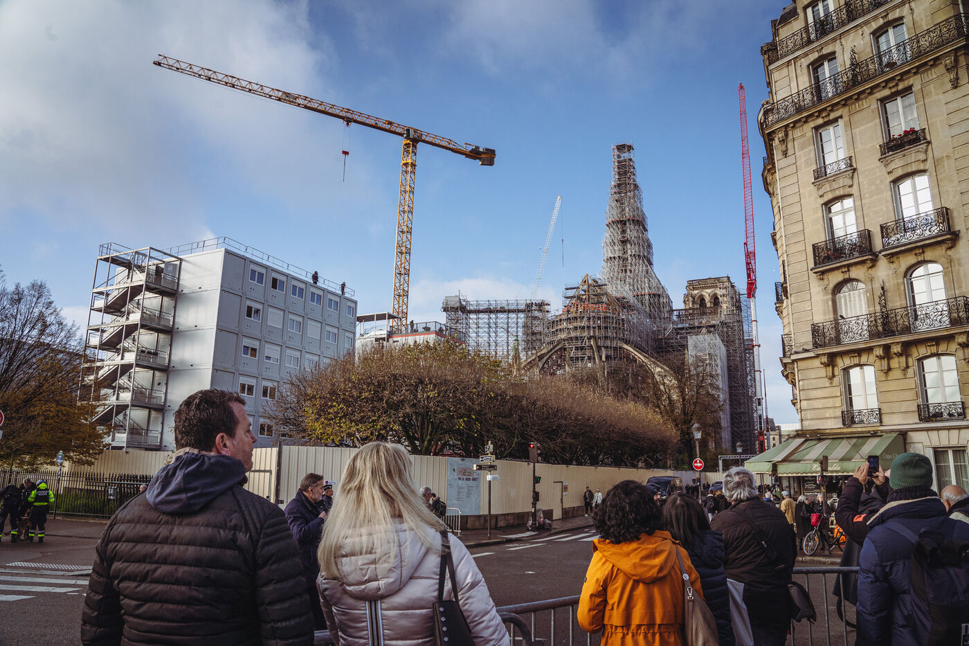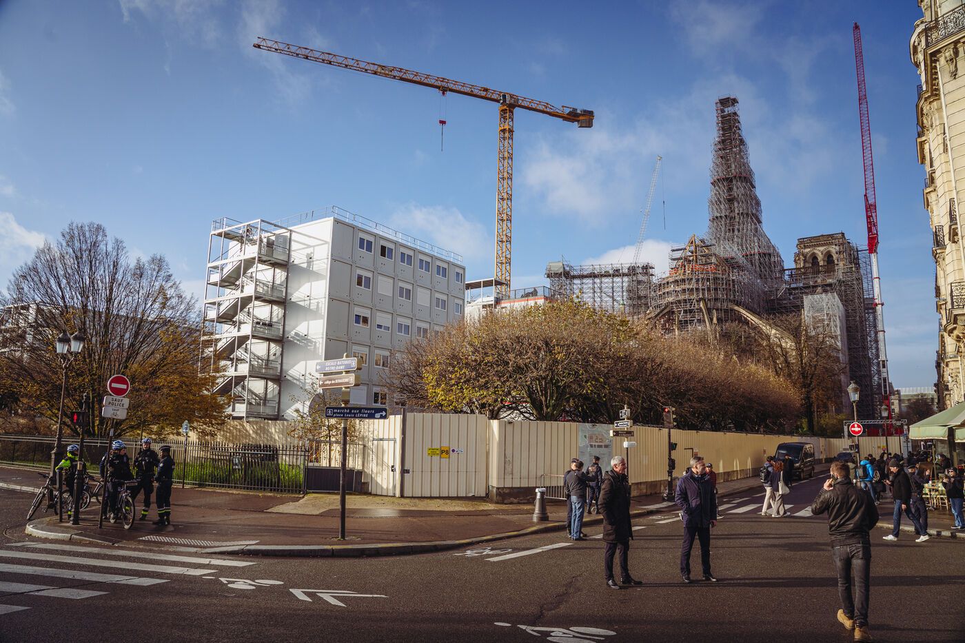 A large number of police officers and security forces, with deserted streets and blocked traffic, were on hand around Notre-Dame Cathedral in Paris for the visit of French President Emmanuel Macron. The President of the Republic has come to see the progress of work on the cathedral's reconstruction site, in particular the spire and roof structure that burned in the fire. One year before the building is due to reopen to the public on December 8, 2024.