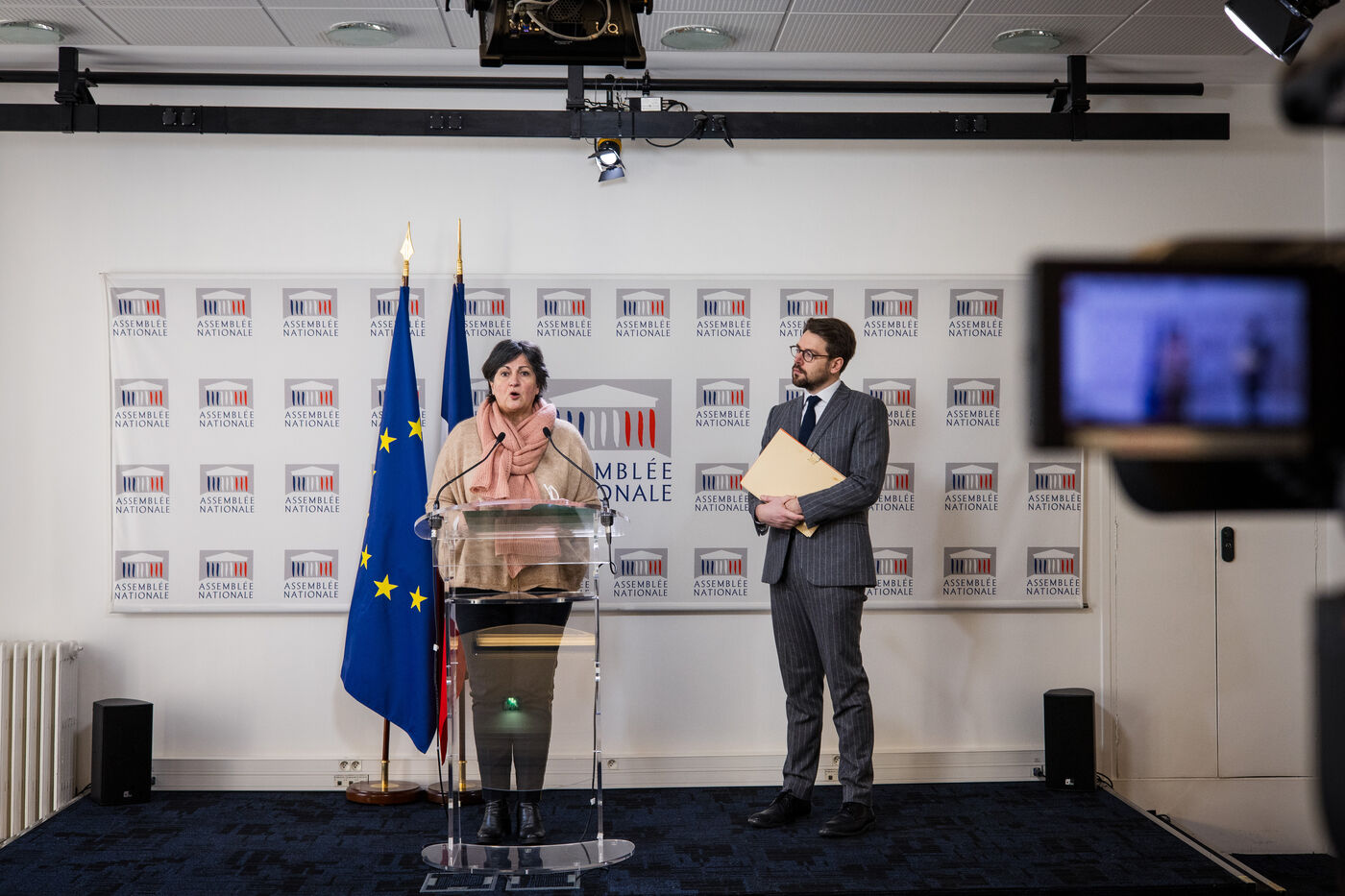Conférence de presse des groupes parlementaires dans la Salle des conférences de presse de l'Assemblée Nationale. Députés Christine Arrighi et Benjamin Lucas (porte parole) du groupe écologiste (Les Ecologistes - EELV), mardi 16 janvier 2024. Sujets abordés : droit de tirage pour commission d'enquête sur le montage juridique et financier du projet d'autoroute A69, projet de loi immigration, remaniement ministériel / nouveau gourvernement...
