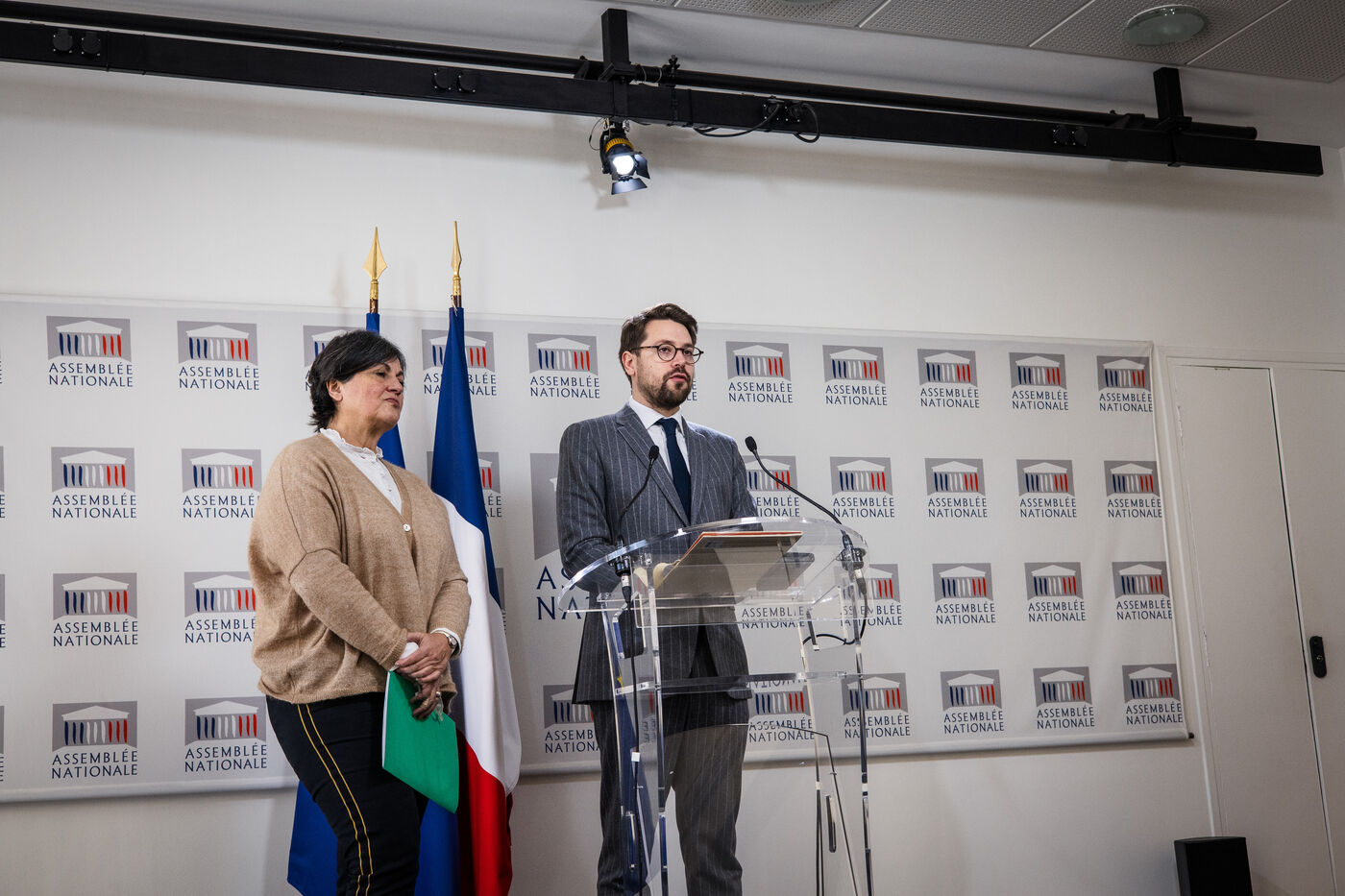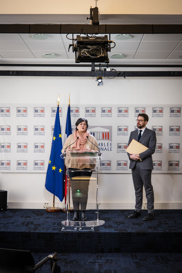 Parliamentary group press conference in the National Assembly press conference room. Deputies Christine Arrighi and Benjamin Lucas (spokesman) of the ecologist group (Les Ecologistes - EELV), Tuesday January 16, 2024. Topics: drawing rights for a commission of inquiry into the legal and financial set-up of the A69 freeway project, immigration bill, ministerial reshuffle / new government...