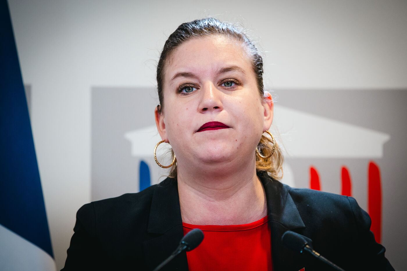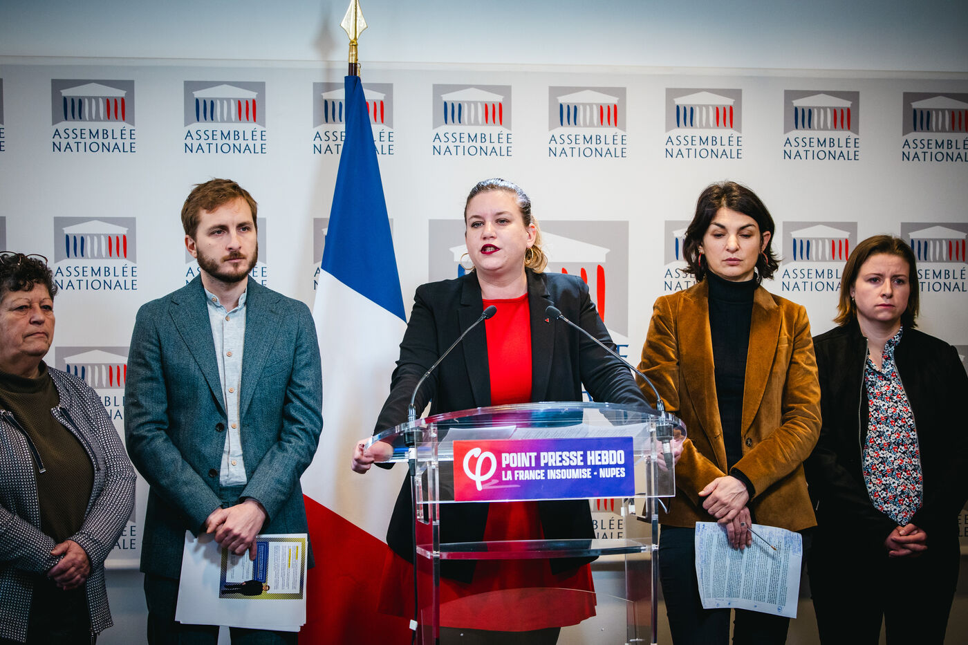Press briefing by Mathilde Panot, President and Insoumise MP, and Insoumise MPs from the La France insoumise - Nouvelle Union Populaire écologique et sociale (LFI-NUPES) group. Parliamentary group press conference in the National Assembly press conference room. Tuesday, January 23, 2024.