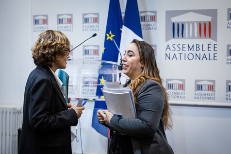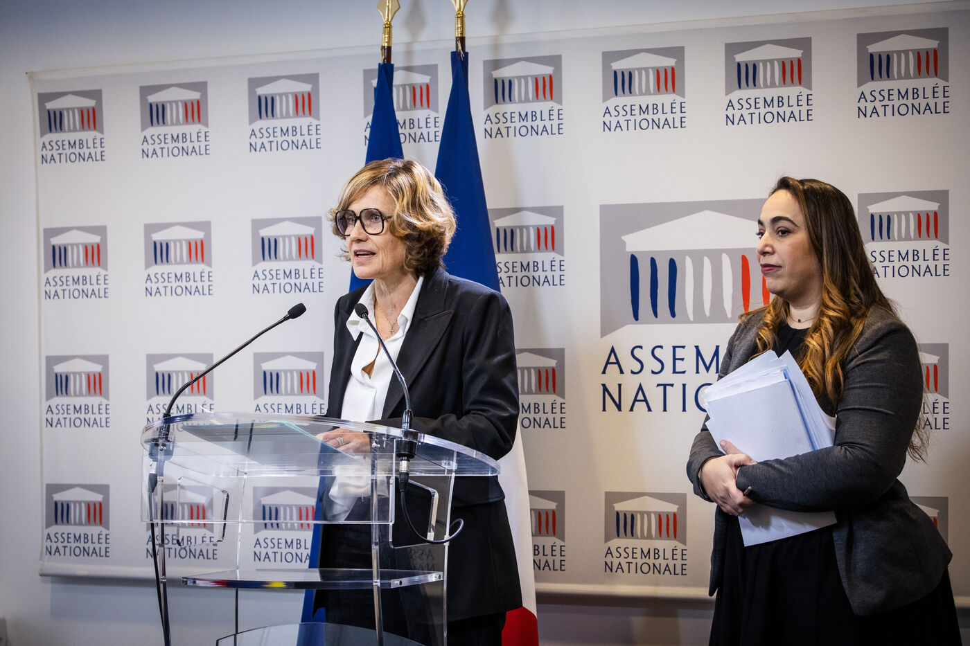 Presentation by Mrs. Béatrice Bellamy (Vendée, HOR), president, and Mrs. Sabrina Sebaihi (Hauts-de-Seine, Écolo-NUPES), rapporteur, of the conclusions of the commission of inquiry into the identification of operational failures within French sports federations, the sports movement and sports governance bodies in their capacity as public service delegates. The report denounces sexist and sexual violence in sport, the omerta, and the self-interests of sports federations, and targets the Ministry of Sport's Signal-sports platform. Platform of the Balance ton sport commission. Parliamentary group press conference in the National Assembly press conference room. Tuesday, January 23, 2024.