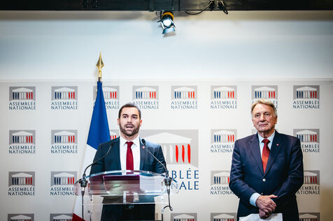 Presentation by deputies Roger Chudeau (RN deputy) and Julien Odoul (RN deputy) of the conclusions of the parliamentary commission of inquiry into failings in the French sports movement. The report condemns sexist and sexual violence in sport, the omerta and self-involvement of sports federations, and targets the Ministry of Sport's Signal-sports platform. Platform of the Balance ton sport commission. Rassemblement National (RN, extreme right) group, press conference room at the French National Assembly. Tuesday, January 23, 2024.
