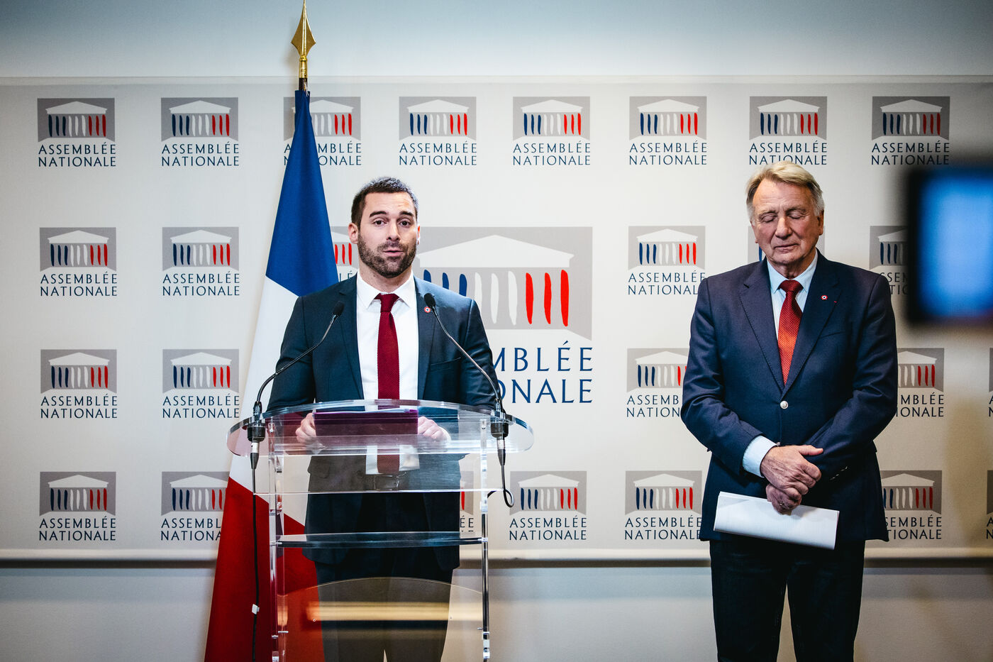 Présentation par les députés Roger Chudeau (député RN) et Julien Odoul (député RN) des conclusions de la commission d'enquête parlementaire sur les défaillances dans le mouvement sportif français. Le rapport dénonce les violences sexistes et sexuelles VSS dans le sport, l'omerta, et l'entre soi des fédérations sportives et cible la plateforme du ministère des sports Signal-sports. Plateforme de la commission Balance ton sport. Groupe Rassemblement National (RN, extreme droite), salle des conférences de presse de l'assemblée nationale. Mardi 23 janvier 2024.