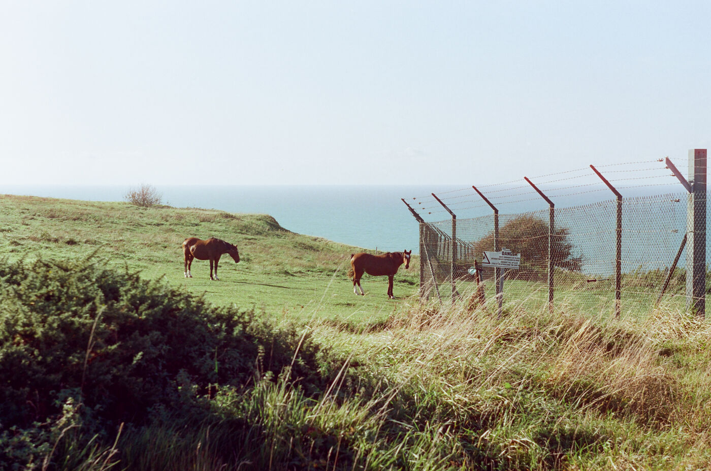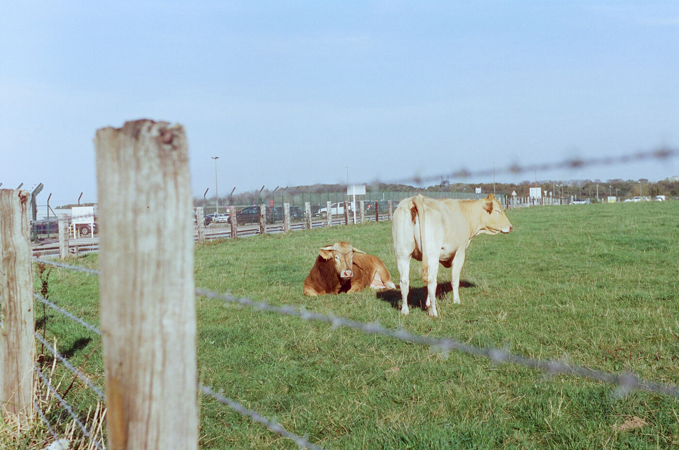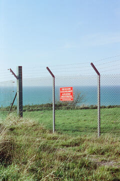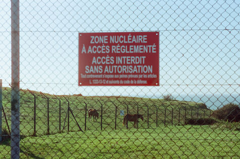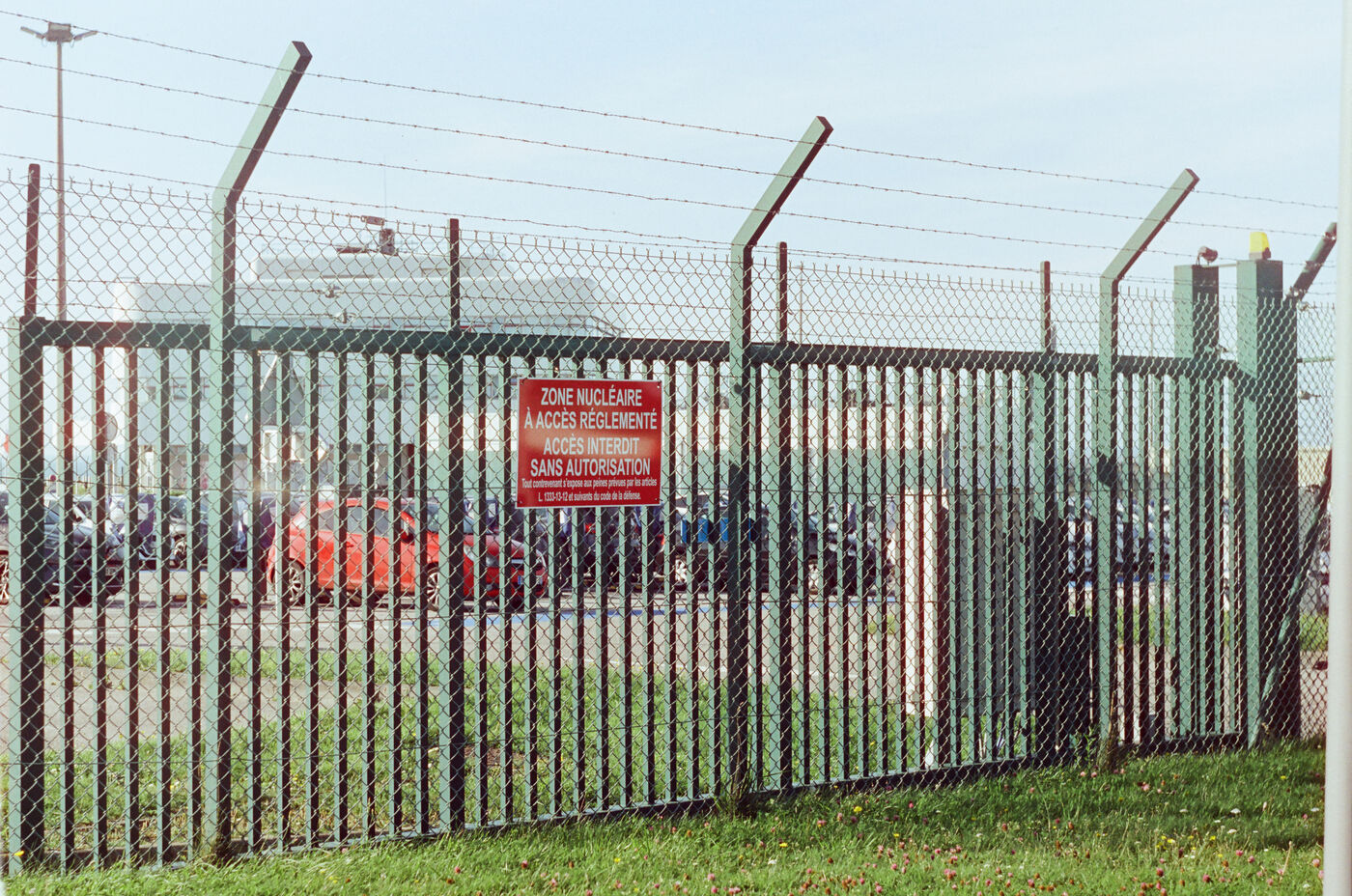 Surrounding the Penly nuclear power plant, located in the commune of Petit-Caux on the English Channel coast (reactors cooled by water from the English Channel). The site has been selected for the construction of new EPRs starting in 2024 (EDF's EPR2 project). Photo taken in October 2023 along the safety fence, with fields and animals on one side and parking lots and access to the power plant on the other. Film photography, Zenit-TTL camera, Sunbath 250D cinema film.