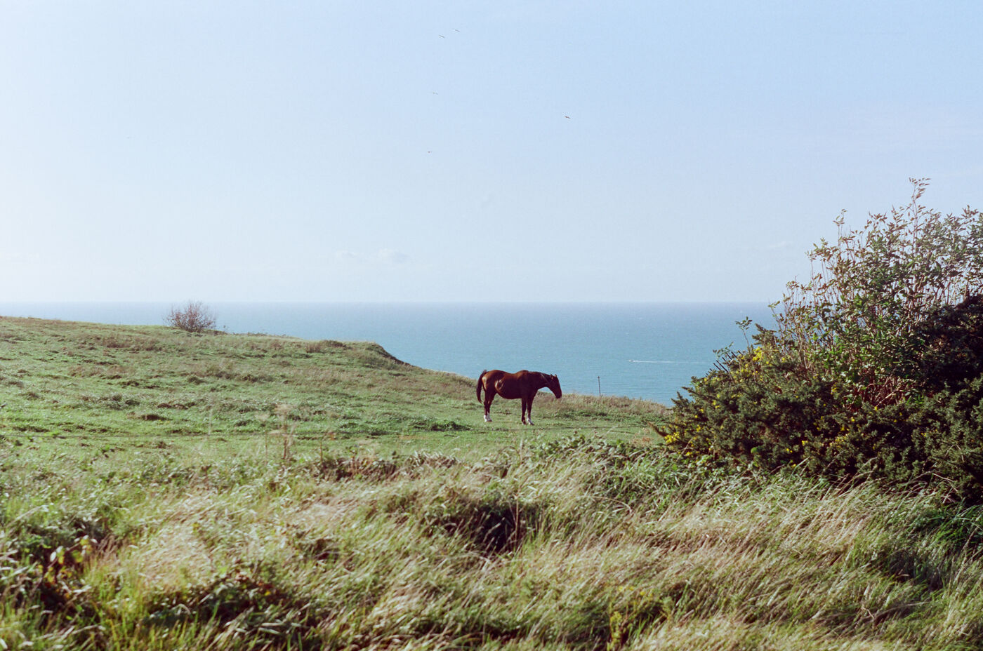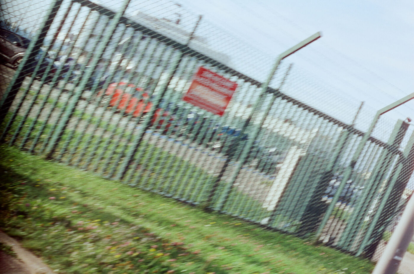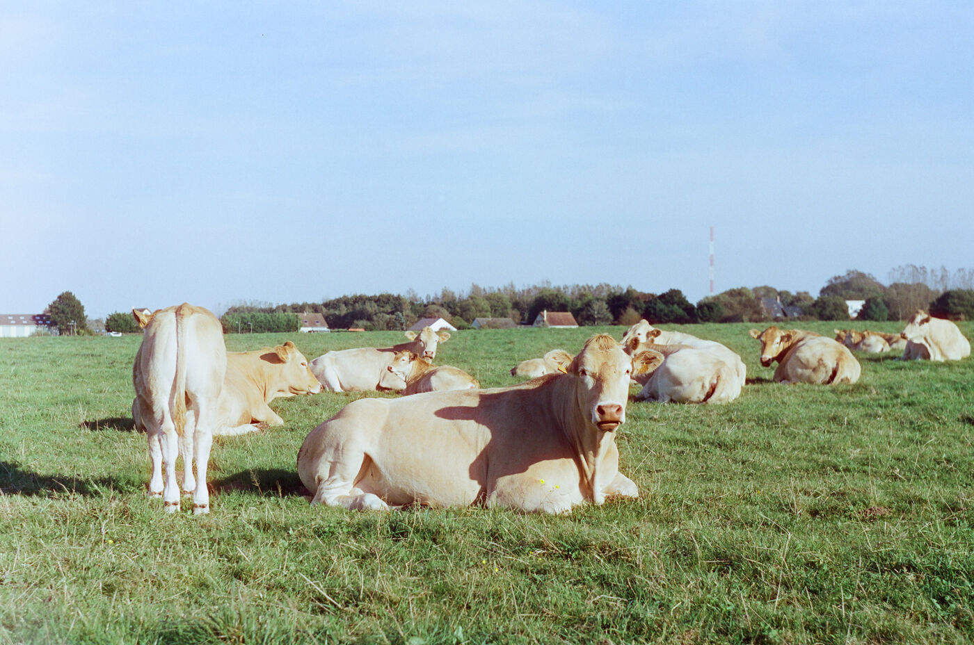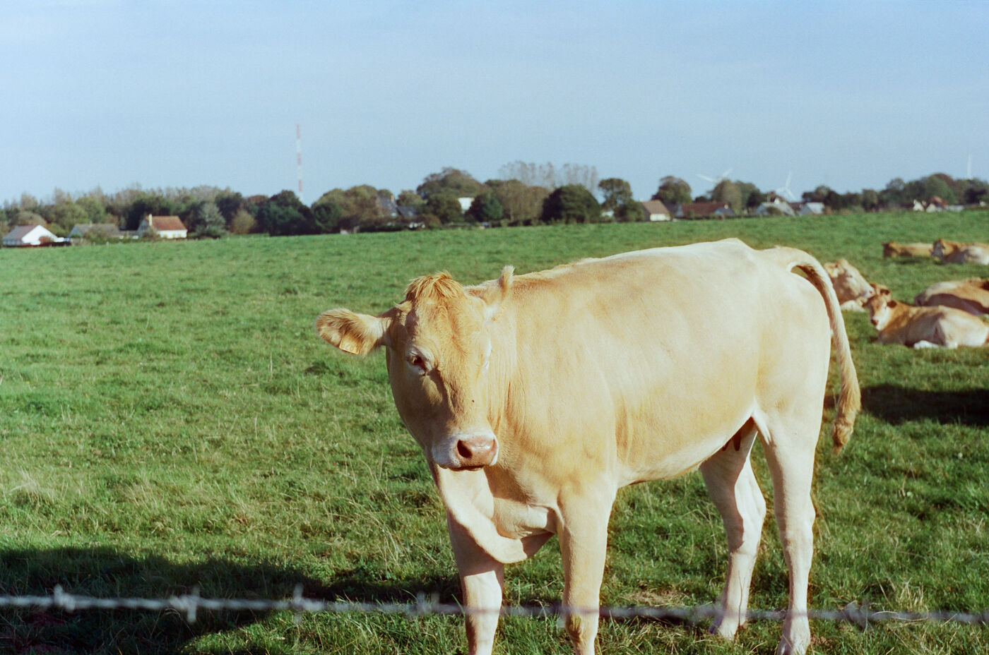 Surrounding the Penly nuclear power plant, located in the commune of Petit-Caux on the English Channel coast (reactors cooled by water from the English Channel). The site has been selected for the construction of new EPRs starting in 2024 (EDF's EPR2 project). Photo taken in October 2023 along the safety fence, with fields and animals on one side and parking lots and access to the power plant on the other. Film photography, Zenit-TTL camera, Sunbath 250D cinema film.