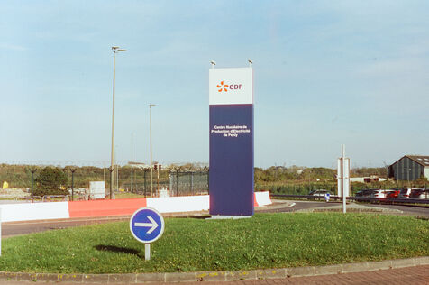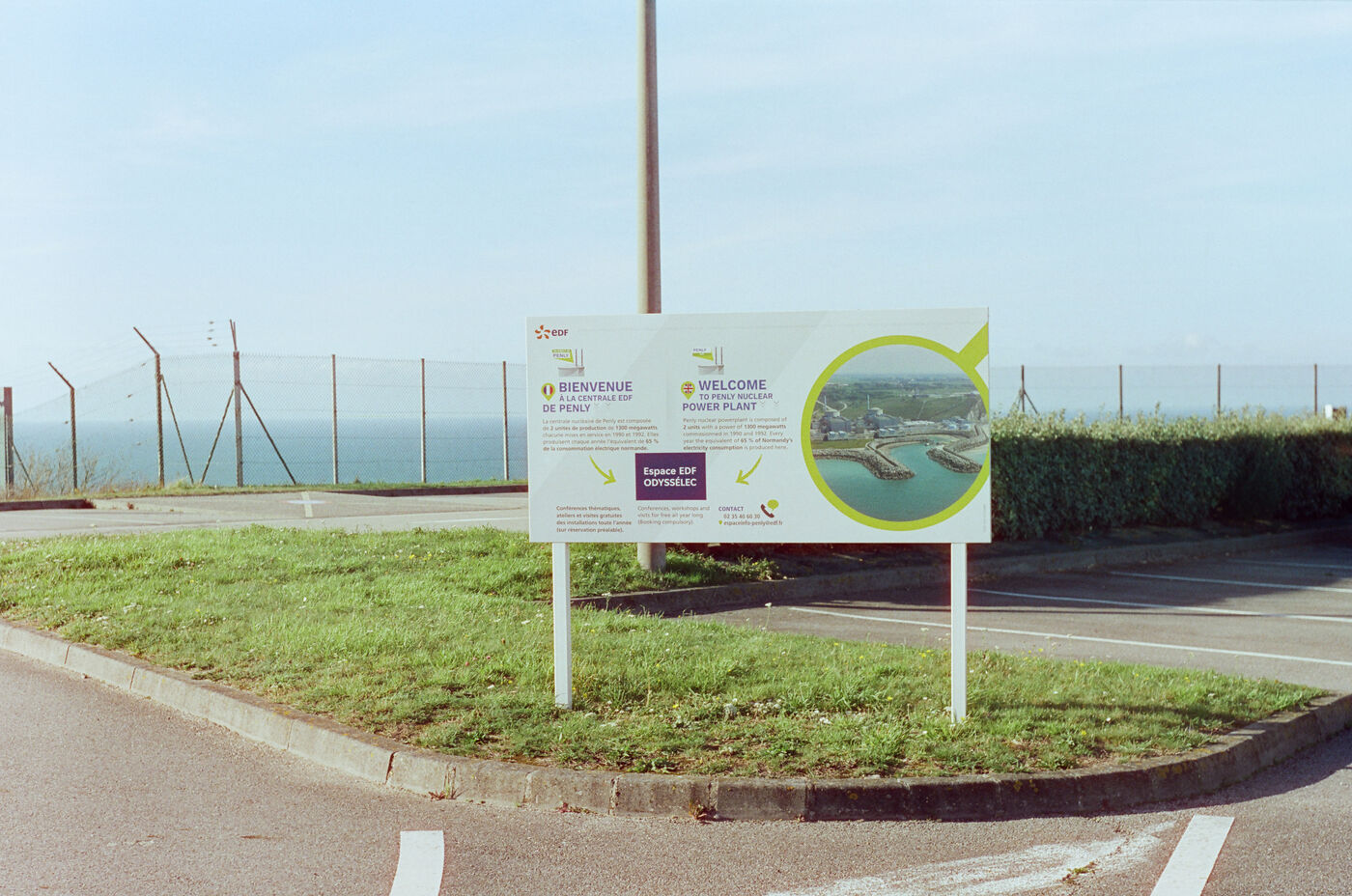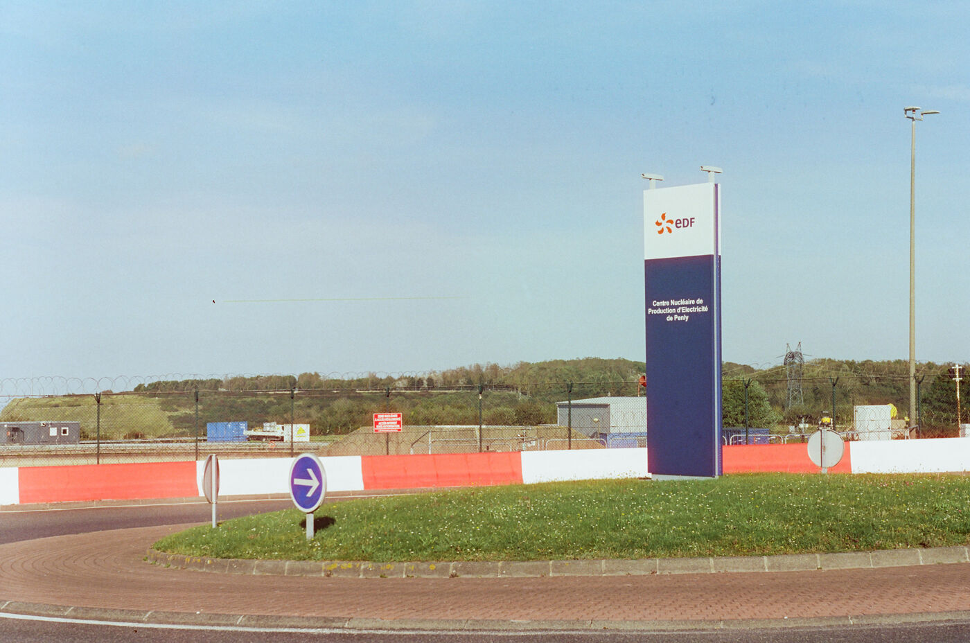 Environs de la centrale nucléaire de Penly, située dans la commune de Petit-Caux sur la côte de la Manche (réacteurs refroidis par l'eau de la manche). Le site a été retenu pour l'implantation de nouveaux EPR à partir de 2024 (projet EPR2 de EDF). Photo faite en Octobre 2023 le long de la barrière de sécurité, d'un côté des champs et des animaux de l'autre les parkings et l'accès à la centrale. Photo argentique, appareil Zenit-TTL, pellicule cinéma Sunbath 250D.