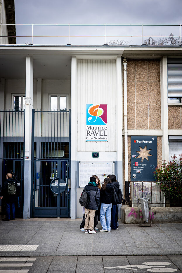 Déplacement de Nicole Belloubet, ministre de l'éducation nationale et de la jeunesse, au lycée Maurice Ravel (Cité scolaire, Paris, 20e arrondissement), accompagnée du préfet de police Laurent Nunez et de Valérie Baglin-Le Goff, directrice de l'académie de Paris. Micro tendu à l'issue de l'entretien de la ministre avec le proviseur de l'établissement scolaire suite à des menaces qu'il a reçues. Il est menacé de mort sur les réseaux sociaux suite à une altercation avec une élève de BTS à qui il a demandé de retirer son voile (respect de la laïcité). Port du voile, plainte et accusations de violences dans l'école publique et laïque. Mardi 5 Mars 2024.