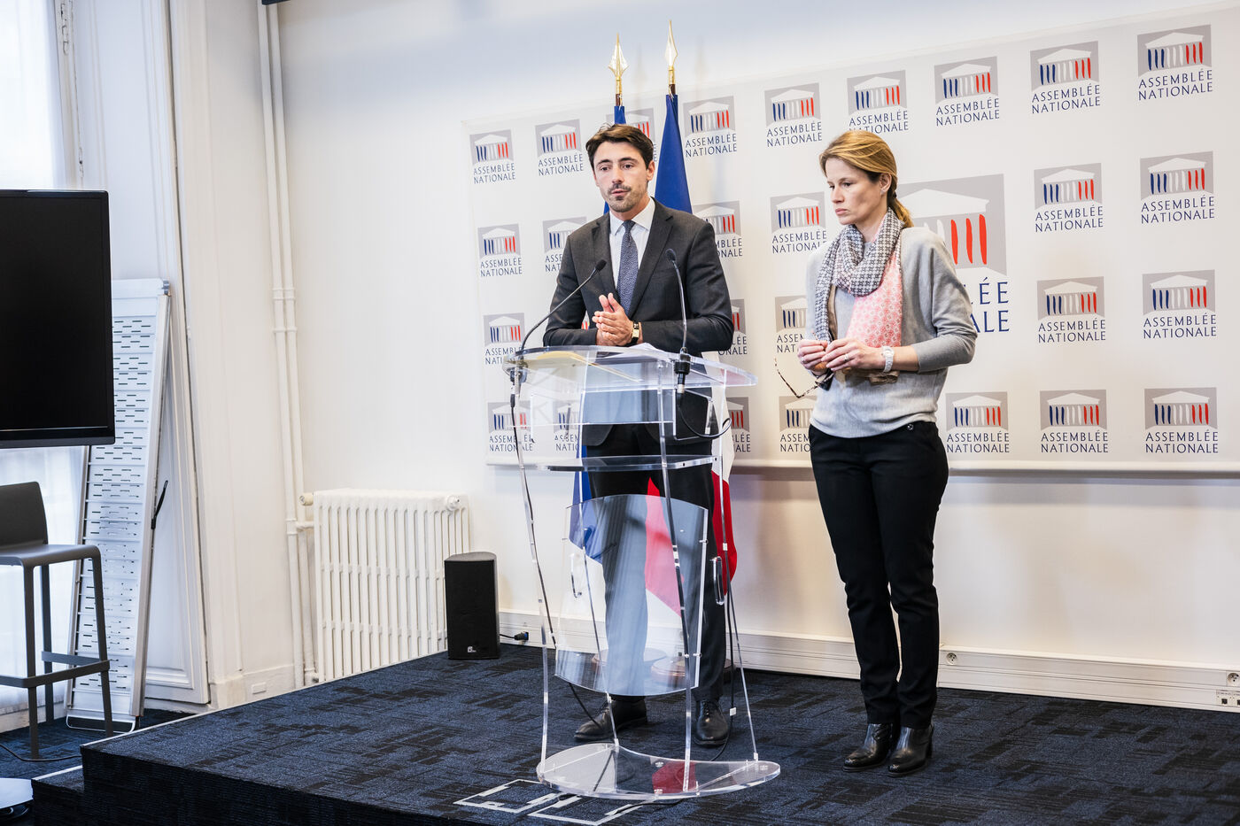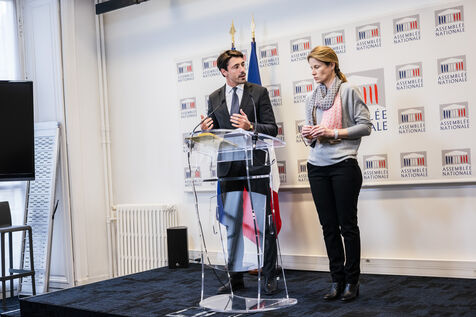 Press conference by members of the presidential majority. Press briefing by Anne-Laure Babault (MP, Modem Democratic Group) and Alexis Izard (MP, Renaissance) on the mission requested by the government to evaluate the law of October 18, 2021 aimed at protecting farmers' remuneration, known as the Egalim 2 law. They reiterated several times that the aim was not to create an Egalim 4 law. National Assembly press conference room, Wednesday March 13, 2024.