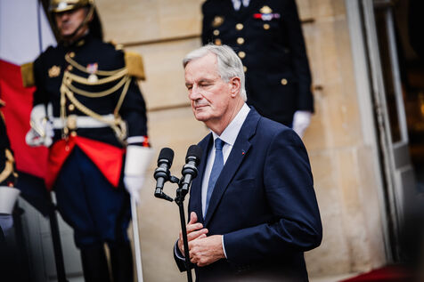 France's outgoing Prime Minister Gabriel Attal and France's new Prime Minister Michel Barnier during the handover ceremony in the courtyard of the Hotel de Matignon in Paris, France on September 5, 2024.