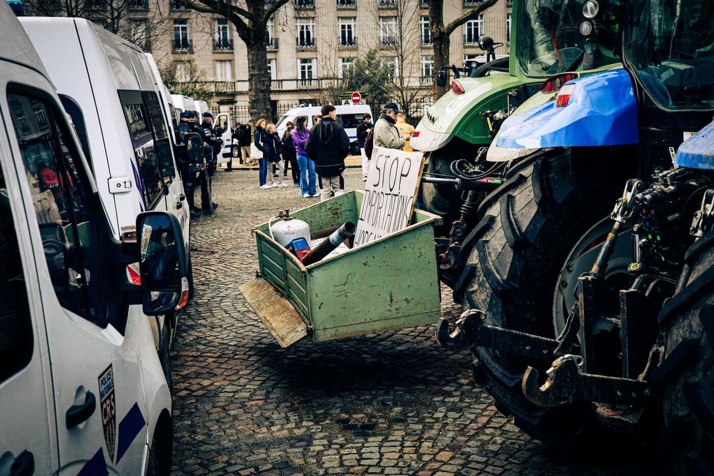 An angry demonstration by farmers and peasants from the Coordination Rurale farming union on the eve of the 60th International Agriculture Fair (Salon International de l'Agriculture SIA), a convoy of tractors set up on Place Vauban behind Les Invalides in Paris, France on February 23, 2024. Farmers across Europe have been protesting for weeks over what they say are excessively restrictive environmental rules, competition from cheap imports from outside the European Union and low incomes.