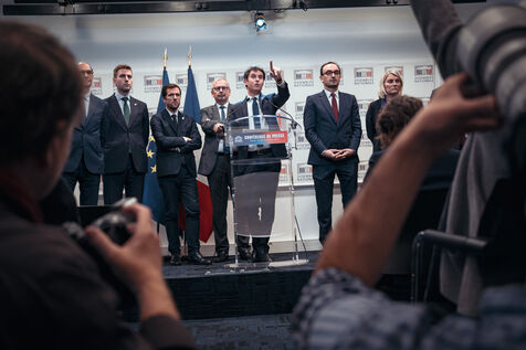 Press conference by Gabriel Attal, MP and Chairman of the ‘Ensemble pour la Republique’ group (EPR, formerly Renaissance) and Macronist MPs on the group's policy and the vote on the budget for 2025 (PLF / PLFSS Finance Bill) at the National Assembly in Paris, France on October 9, 2024.