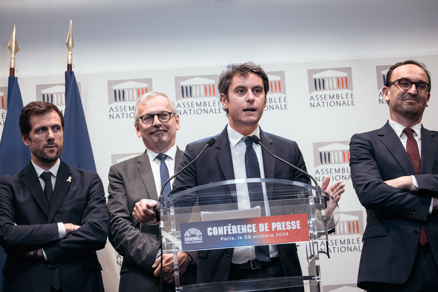 Conference de presse de Gabriel Attal, depute et president du groupe "Ensemble pour la Republique" (EPR, ex Renaissance) et de deputes macronistes sur la politique du groupe et le vote du du budget pour 2025 (Projet de Loi de Finances PLF / PLFSS) a l'assemblee nationale a Paris, France le 9 Octobre 2024.