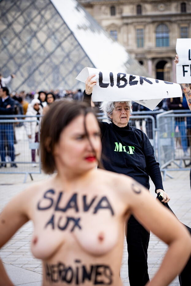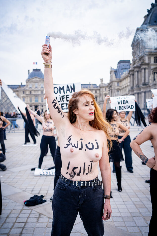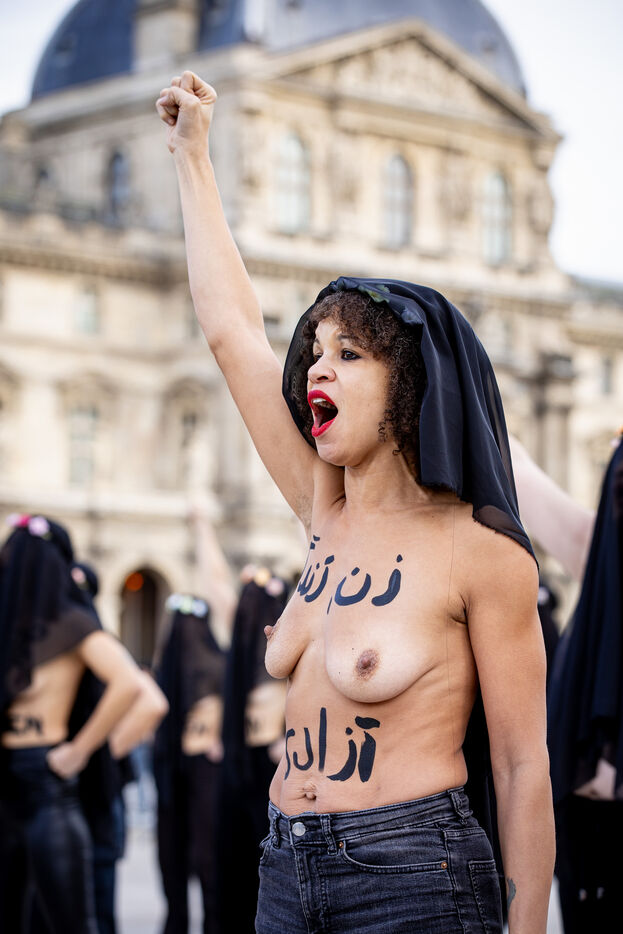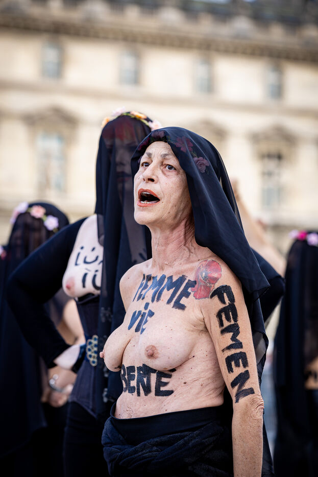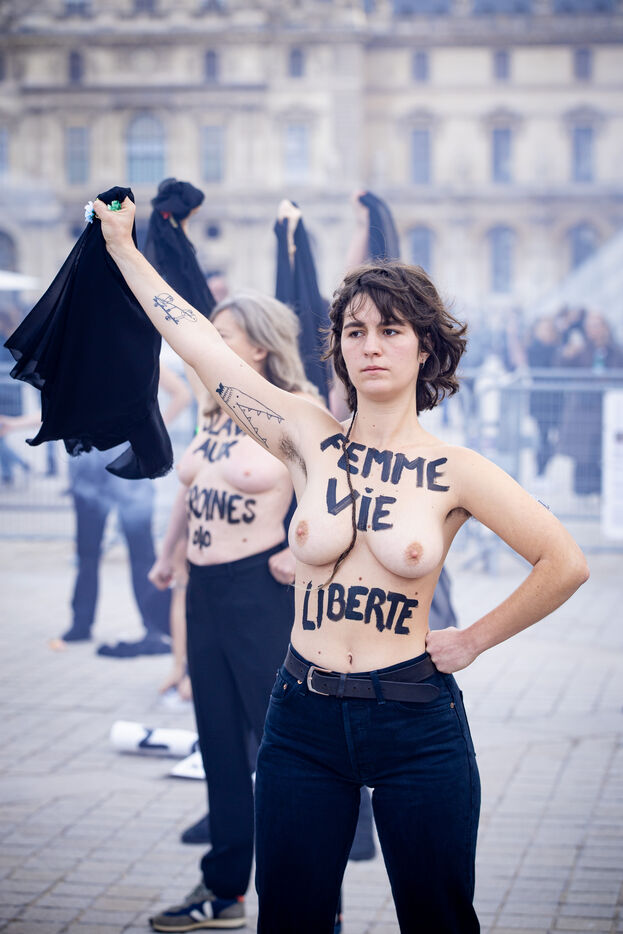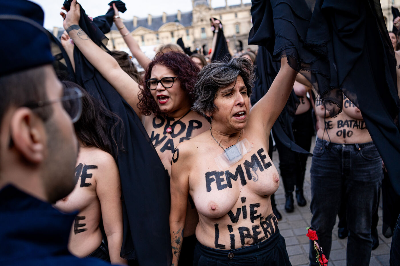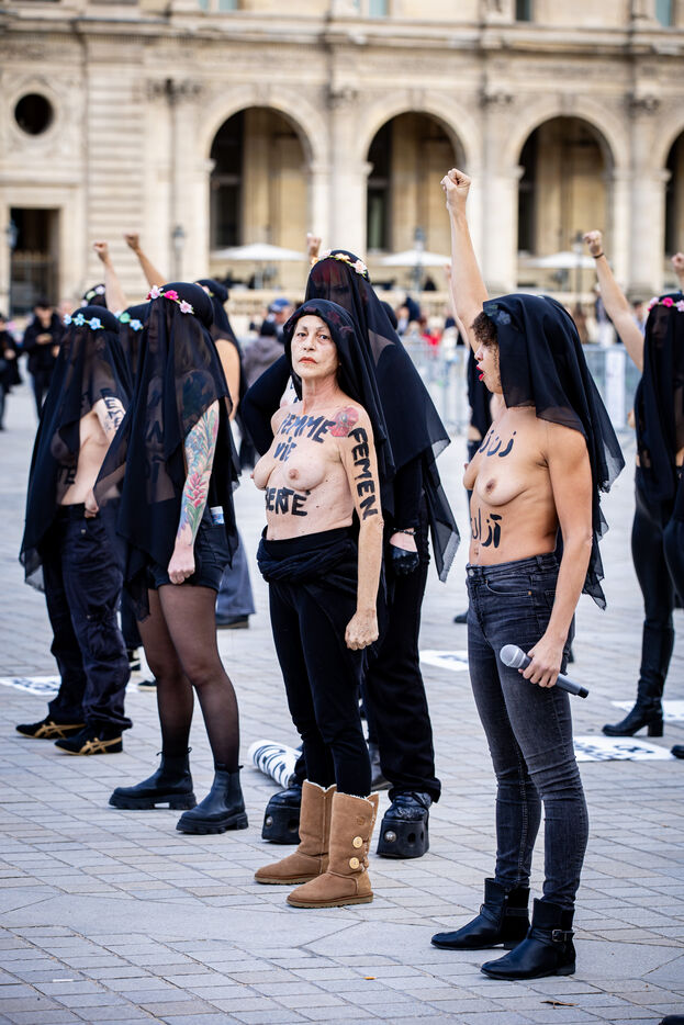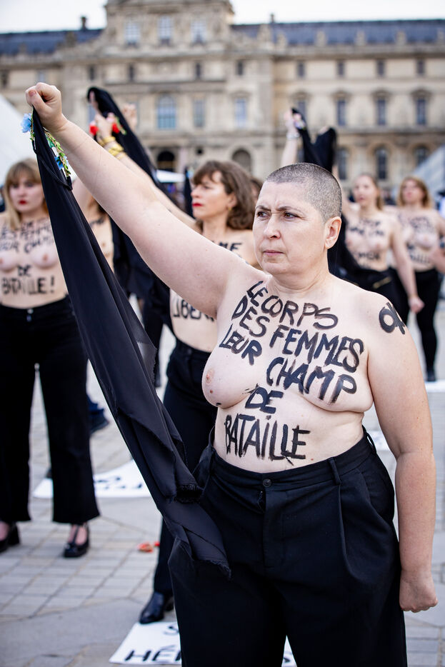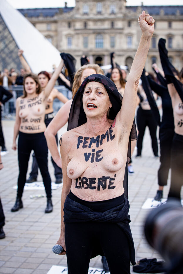 A major action by FEMEN activists, bringing together around a hundred women demonstrators from all over the world to lift the veil against violence against women throughout the world and particularly in the Middle East, in front of the Louvre Pyramid in Paris, France on November 24, 2024.