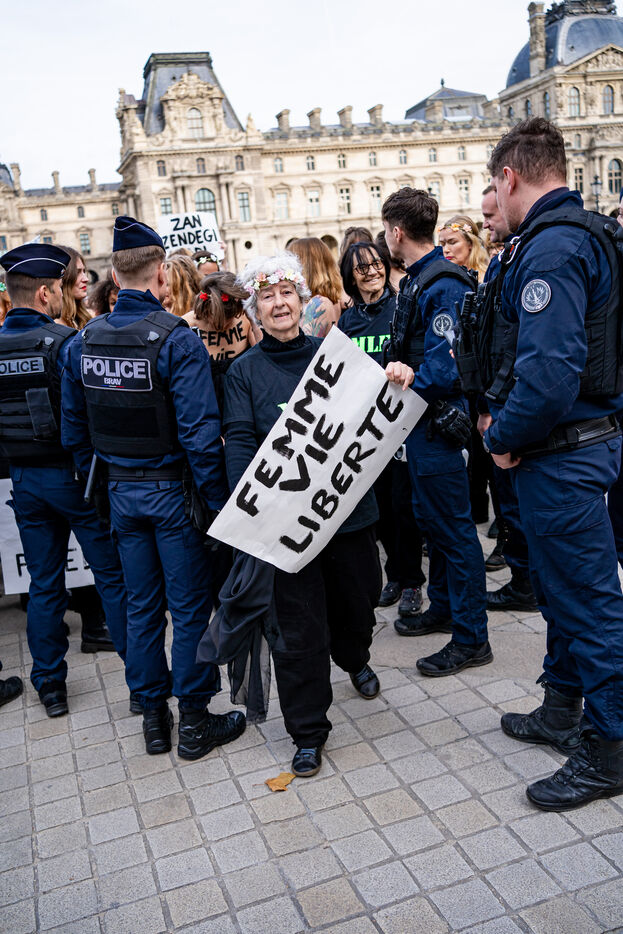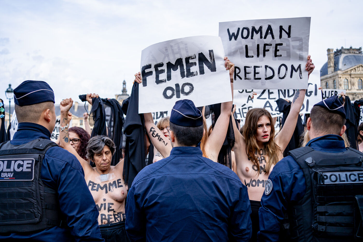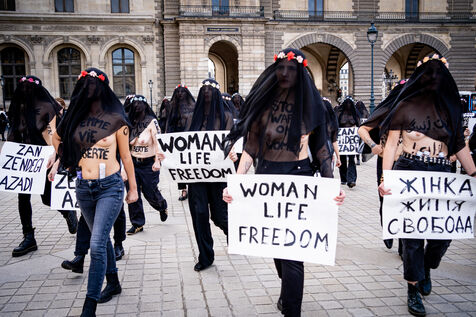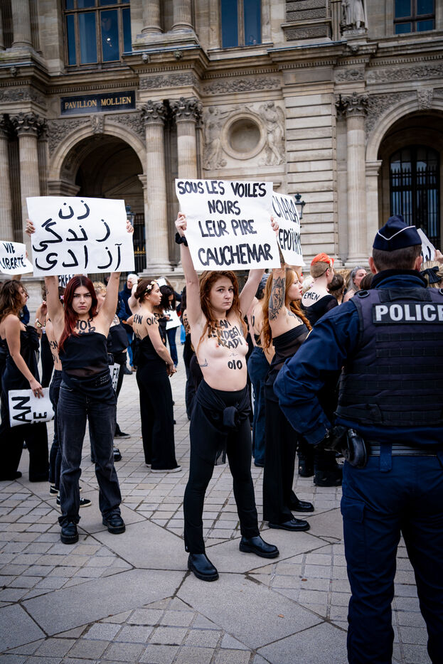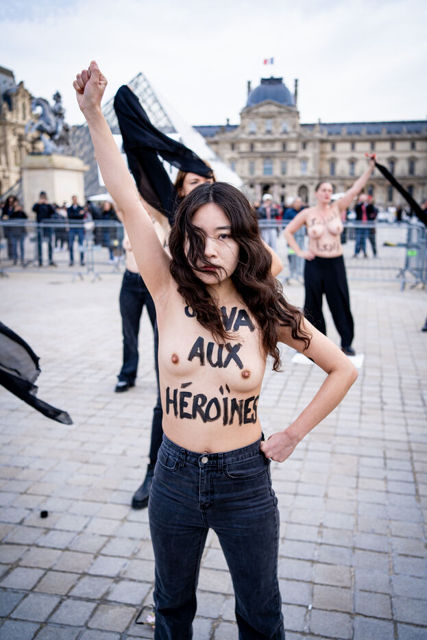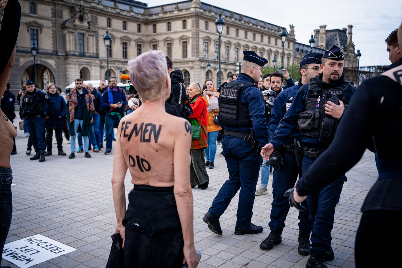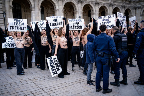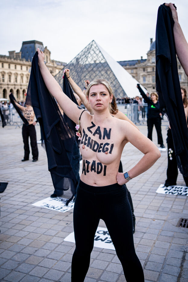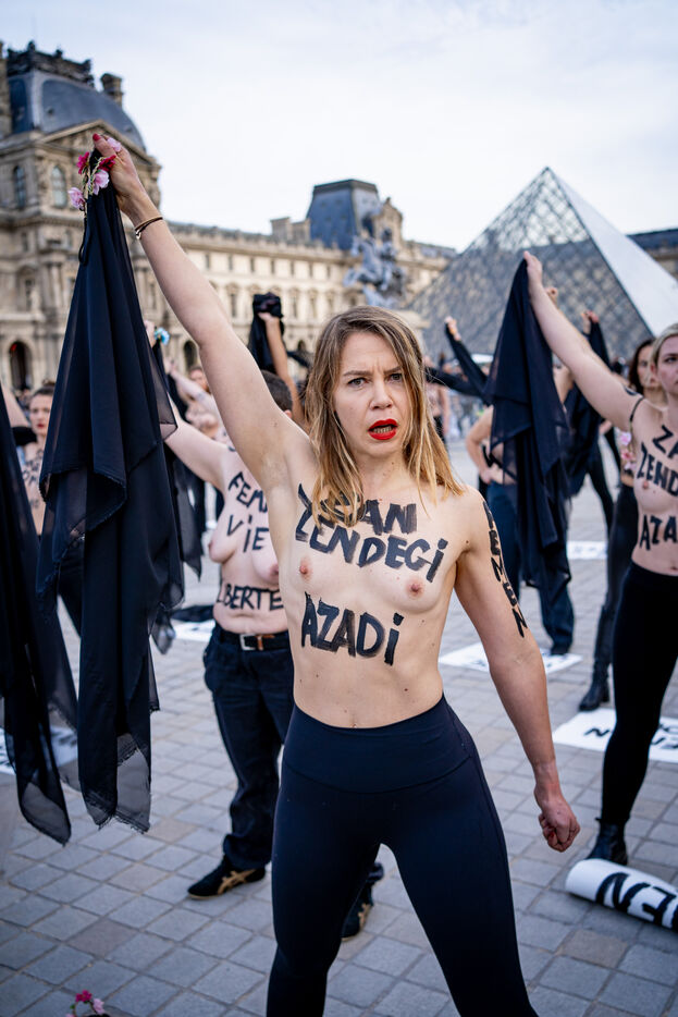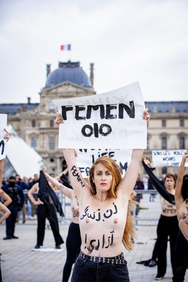 A major action by FEMEN activists, bringing together around a hundred women demonstrators from all over the world to lift the veil against violence against women throughout the world and particularly in the Middle East, in front of the Louvre Pyramid in Paris, France on November 24, 2024.