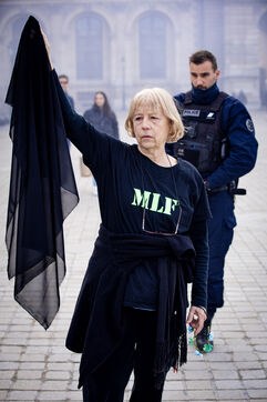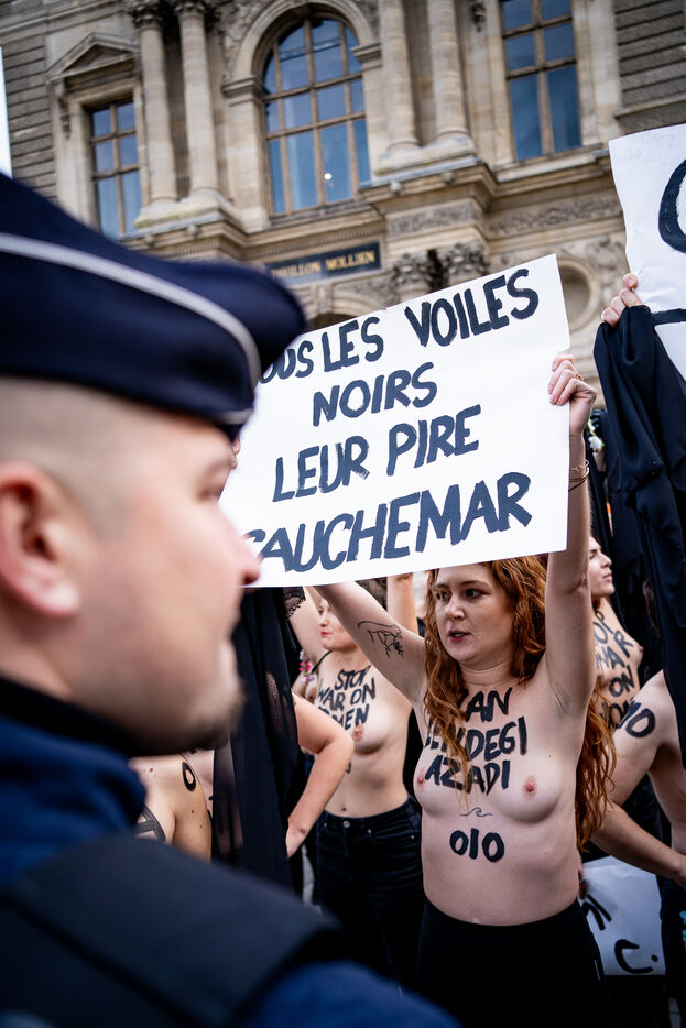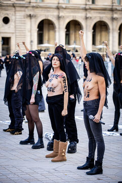 Grande action des activistes FEMEN regroupant une centaine de femmes manifestantes venues de partout pour lever le voile contre les violences faites aux femmes dans le monde entier et en particulier au Moyen Orient, devant la pyramide du Louvre à Paris, France le 24 Novembre 2024.