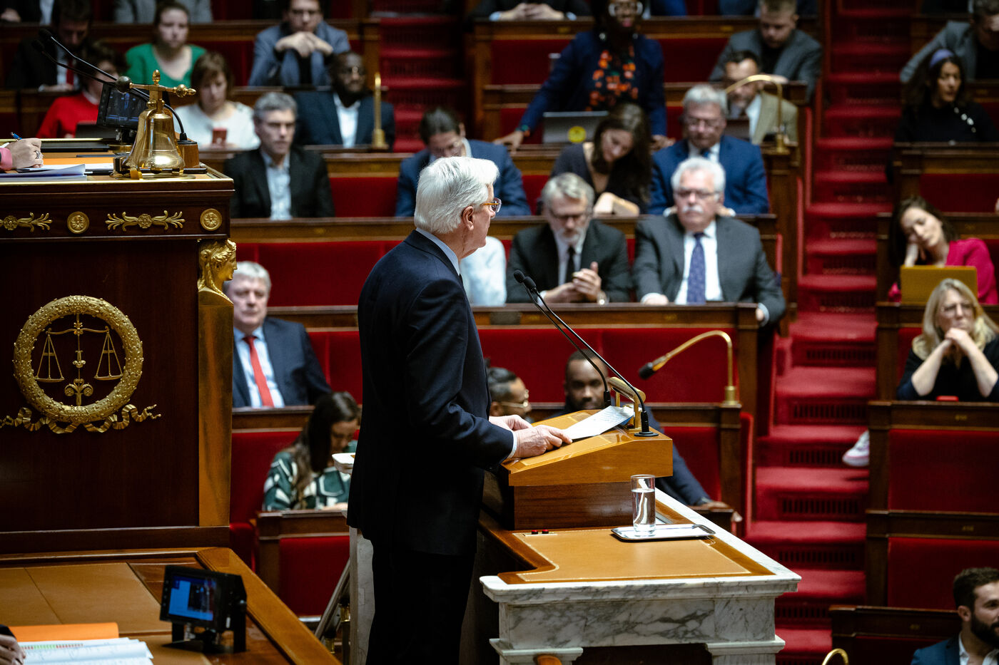 Examen en séance du rapport de la commission mixte paritaire CMP sur le projet de loi de finances de la sécurité sociale pour 2025 (PLFSS, budget), à l'Assemblée Nationale à Paris, France le 2 Décembre 2024. Utilisation de l'article 49.3 de la constitution par le premier ministre qui engage la responsabilité de son gouvernement et s'expose à des motions de censure par la gauche et l'extrême droite.