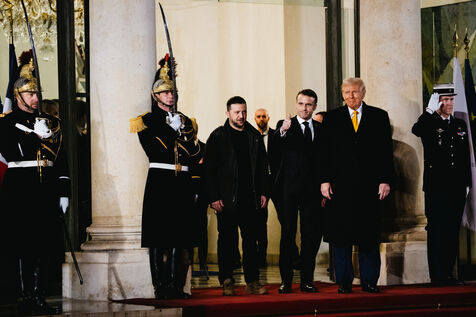 France's President Emmanuel Macron welcomes United States President-elect Donal Trump and Ukraine's President Volodymyr Zelensky for a series of bilateral talks that have become trilateral talks, arriving and departing in the Main Courtyard of the Presidential Palace in Paris, France on December 7, 2024.