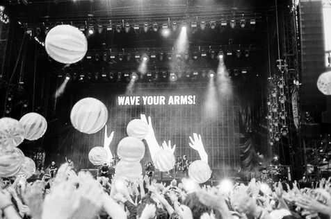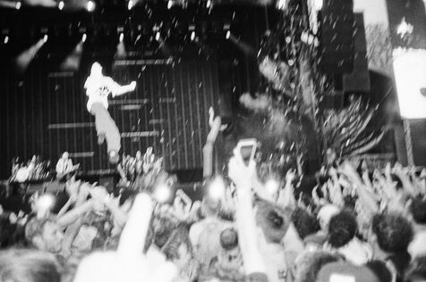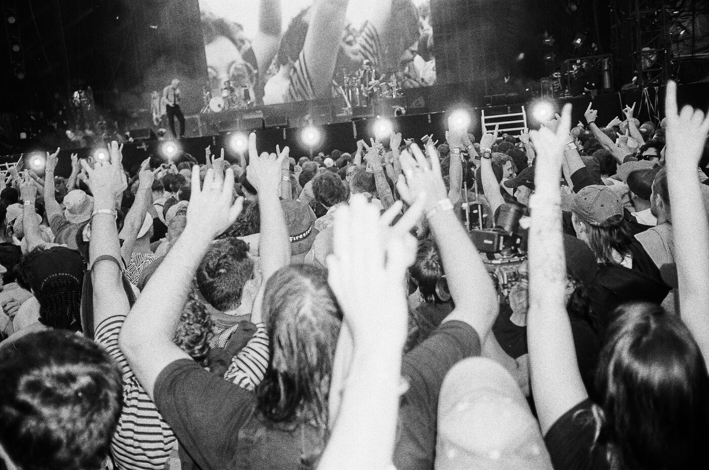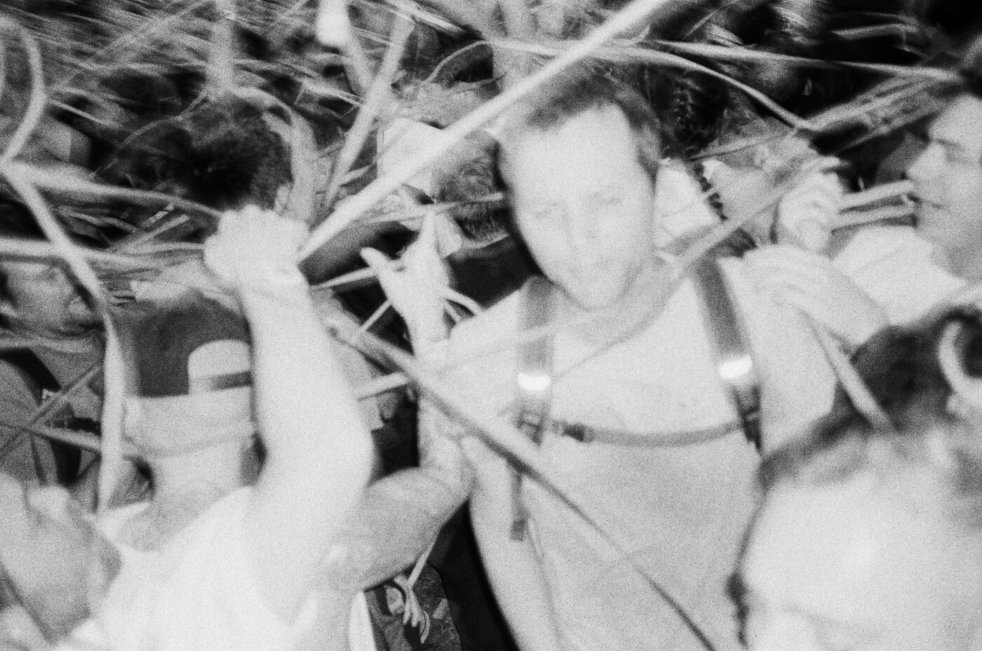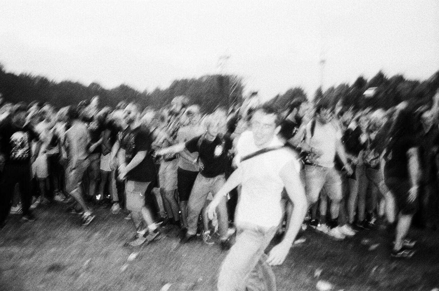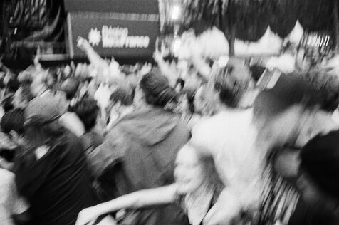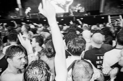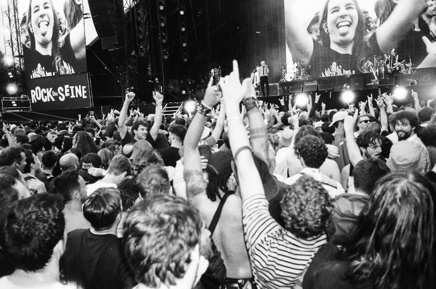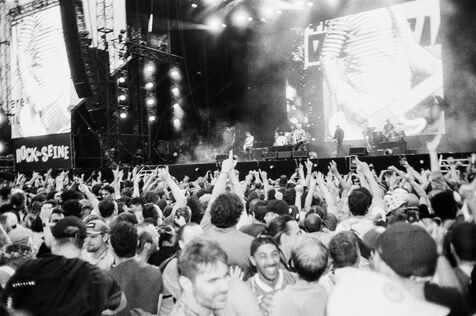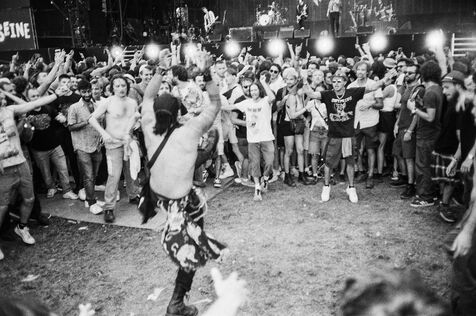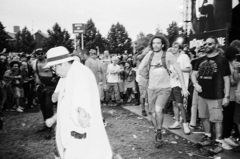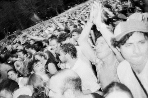 In the middle of a pogo with Festival-goers during a concert by American punk rock band The Offspring at the Rock en Seine festival at the Domaine National in Saint Cloud, France on August 24, 2024. Black and white photograph, Sunbath Double X silver film, Olympus Mju II camera.
