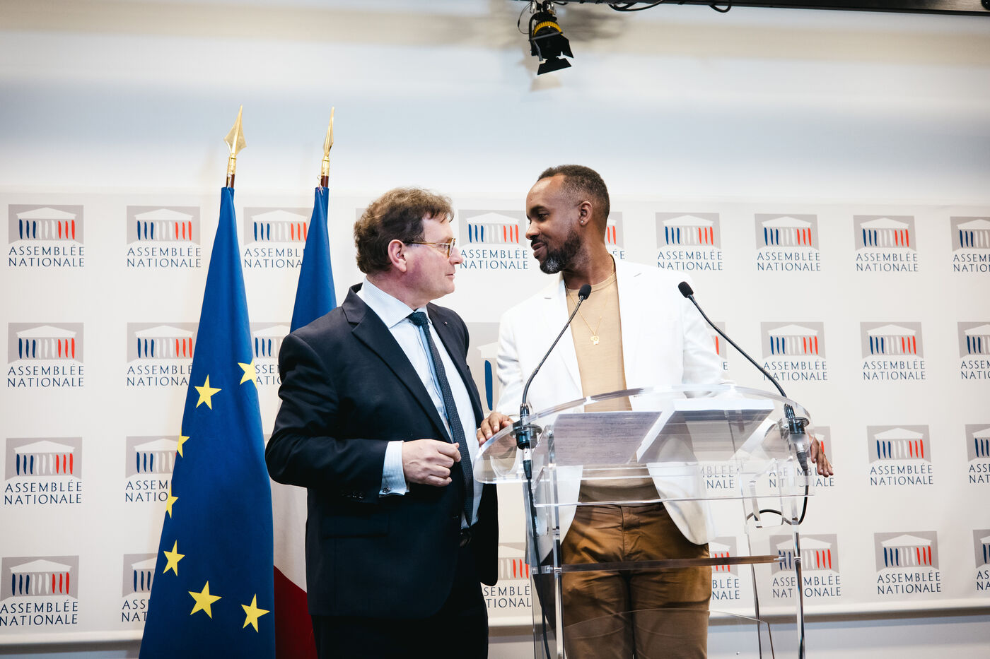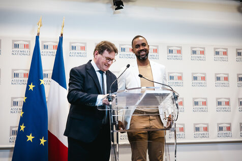 Présentation par les députés co‑rapporteurs Davy Rimane (élu de Guyane, groupe Gauche démocrate et républicaine GDR, gauche communiste, Nouveau Front Populaire NFP) et Philippe Gosselin (élu de la Manche, Droite Républicaine DR) du rapport d'information sur l'avenir institutionnel des outre‑mer (DOM TOM / DROM COM, territoires ultramarins), salle des conférences de presse de l'Assemblée Nationale à Paris, France le 15 Janvier 2025. Institutions présentes dans les outrer mer et leurs caractéristiques, passé colonial de la France (colonies francaises).