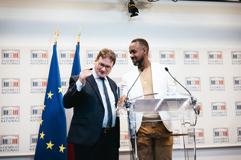 Presentation by co-rapporteurs Davy Rimane (elected member for Guyane, GDR Democratic and Republican Left Group, Communist Left, NFP New Popular Front) and Philippe Gosselin (elected member for La Manche, DR Republican Right) of the information report on the institutional future of overseas France (DOM TOM / DROM COM, overseas territories), press conference room of the National Assembly in Paris, France on January 15, 2025. Institutions present in the overseas territories and their characteristics, France's colonial past (french colonies).