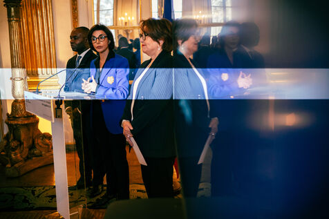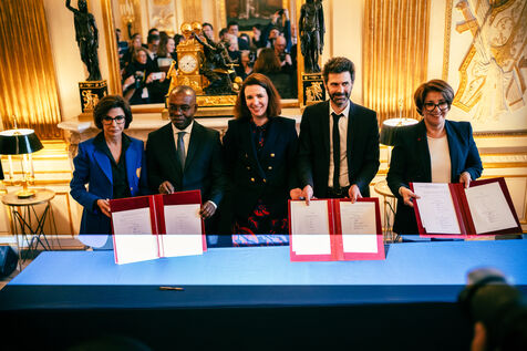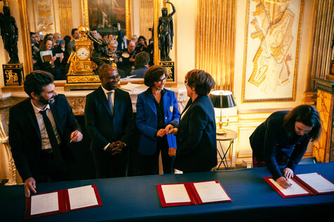 Lancement de l’initiative Heritage Watch A.I. en marge du Sommet pour l'action sur l'Intelligence Artificielle, au ministère de la Culture à Paris, France le 10 Février 2025. Signature d'un partenariat unique entre l'Alliance internationale pour la protection du patrimoine dans les zones en conflit (ALIPH), l'entreprise Microsoft, la société d'imagerie satellite Planet et la startup pionnière du patrimoine numérique Iconem.