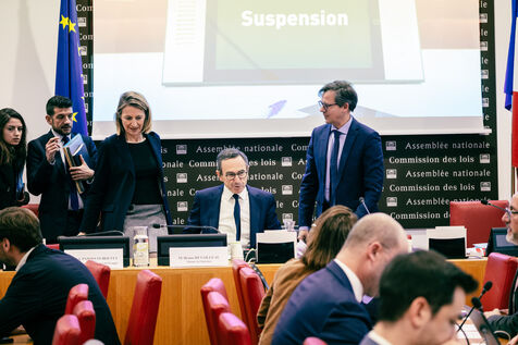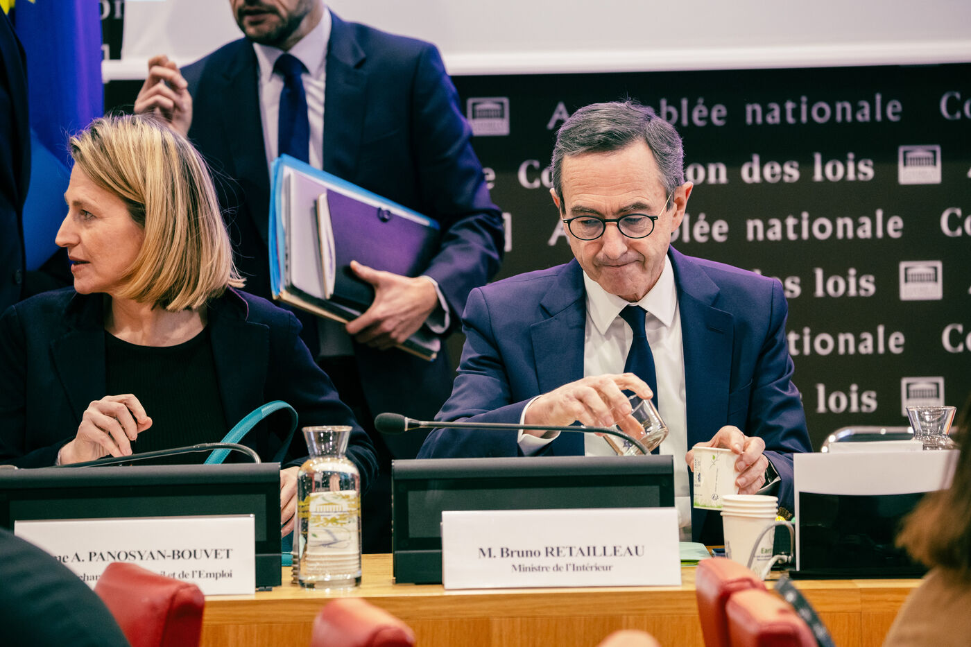 Hearing of France's Minister of State, Minister of the Interior Bruno Retailleau, and France's Minister of Labour, Health, Solidarity and the Family, responsible for Labour and Employment Astrid Panosyan-Bouvet, on the circular of 23 January 2025 setting out the general guidelines for the exceptional admission to residence provided for in articles L.435-1 and following of the Code on the Entry and Residence of Foreigners and the Right of Asylum and on regularisations justified by work (immigration, immigrant workers) by members of the Law Commission of the French National Assembly in Paris, France on February 12, 2025.