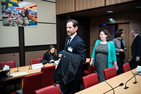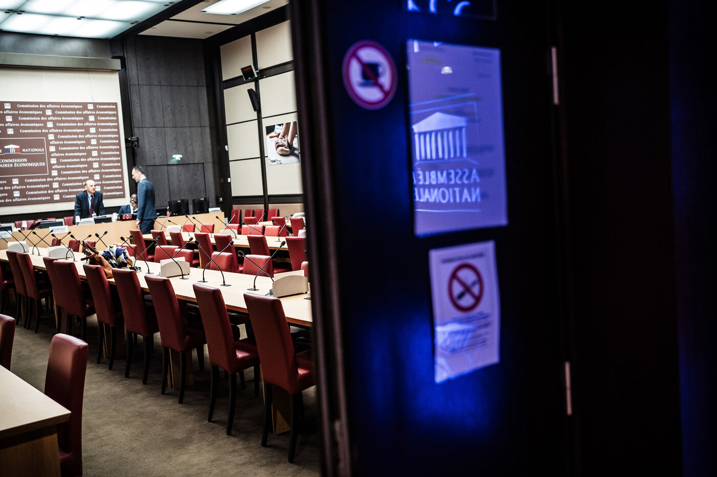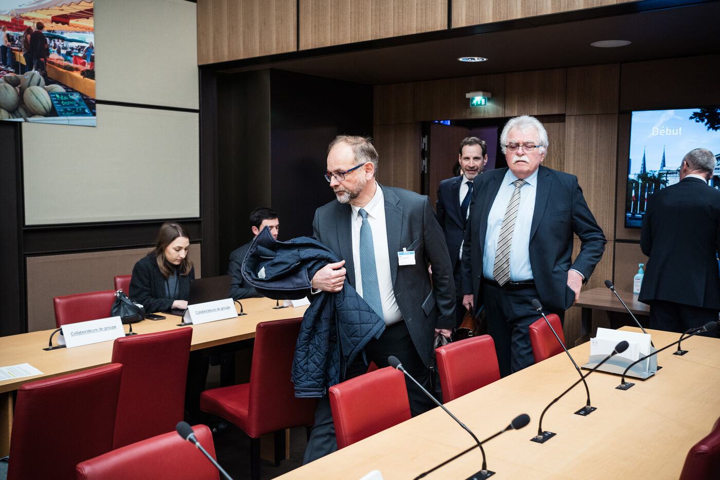 Hearing of Jean-Luc Beal, Chairman of Vencorex France, and Fabien Tayart de Borms, Associate Director of AlixPartners (analysis and business consultancy firm), on the economic situation and development prospects of Vencorex's activities in France, by members of the Economic Affairs Committee at the National Assembly in Paris, France, on March 18, 2025. The Isere-based company is in receivership and is in danger of being wound up (job losses, redundancy plan).