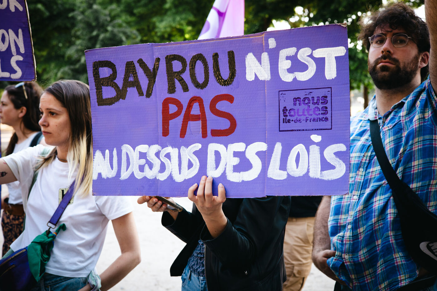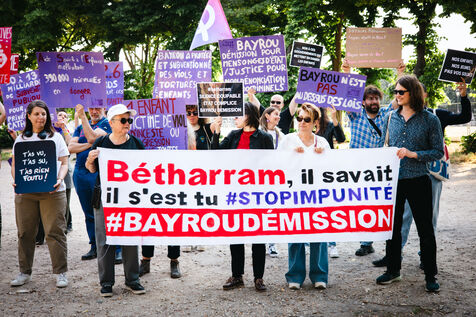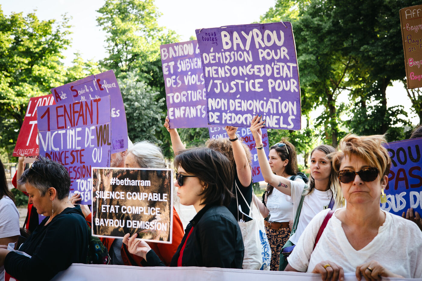 Gathering of feminist and children's associations and groups in support of children who are victims of violence on the esplanade des Invalides during the hearing of France's Prime Minister Francois Bayrou by the deputies of the commission of enquiry into the methods used by the State to control and prevent violence in schools, a hearing into acts of violence at the Notre-Dame de Betharram private school (a Catholic establishment) at the National Assembly in Paris, France on May 14, 2025.
