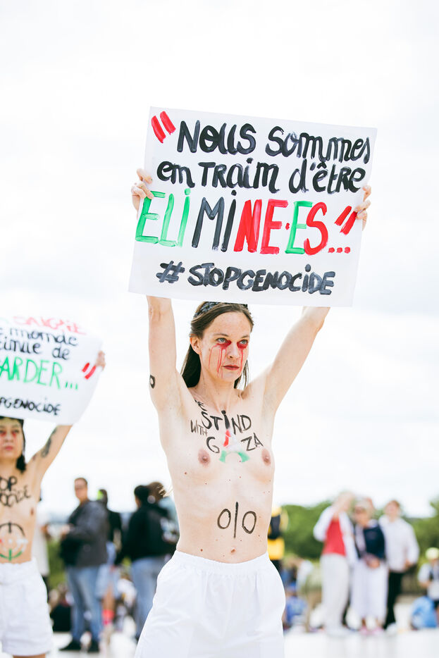 Action by FEMEN activists on the Human Rights Parvis (Place du Trocadero) in support of the Palestinian and Gazan population to alert and denounce the situation in Palestine and especially in Gaza (genocide committed by the Israeli army in retaliation for the terrorist attacks of 7 October 2023 committed by Hamas), in Paris, France on June 8, 2025. The topless demonstrators held up placards and shouted the slogans ‘Israel and Hamas out of Gaza, Stop genocide, We stand with Gaza’, before spraying themselves with fake blood and falling to the ground to illustrate the thousands of civilians who have died in this war (Israeli-Palestinian conflict).