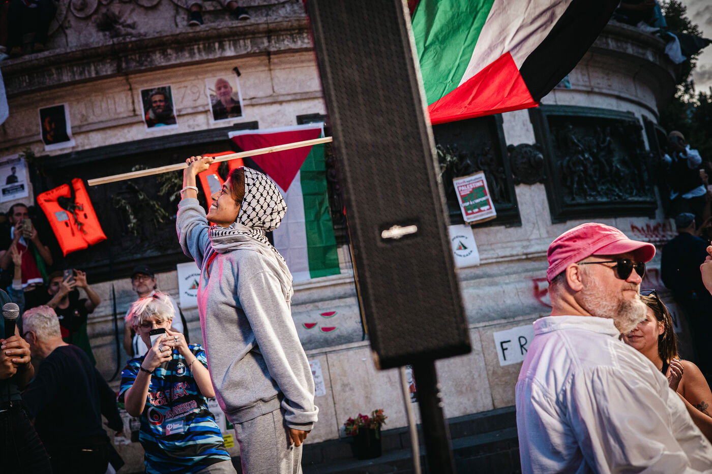 Gathering on the Place de la République to celebrate the liberation and return to France of some of the crew of the boat Madleen, Freedom Flotilla including MEP Rima Hassan, intercepted by the Israeli army on its way to Gaza to bring humanitarian aid to the Palestinian population against the blockade in Palestine, in Paris, France on June 12, 2025.