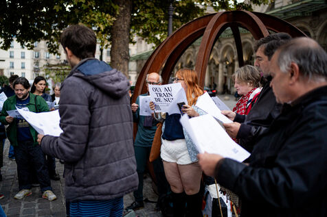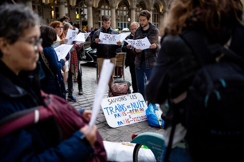 Demonstration on the forecourt of Gare de l'Est station in the form of a pyjama party rally to keep night trains running. According to the user group ‘Oui au train de nuit’ (Yes to night trains), the Paris-Vienna and Paris-Berlin night services could disappear due to a lack of state subsidies in Paris, France on September 26, 2025.