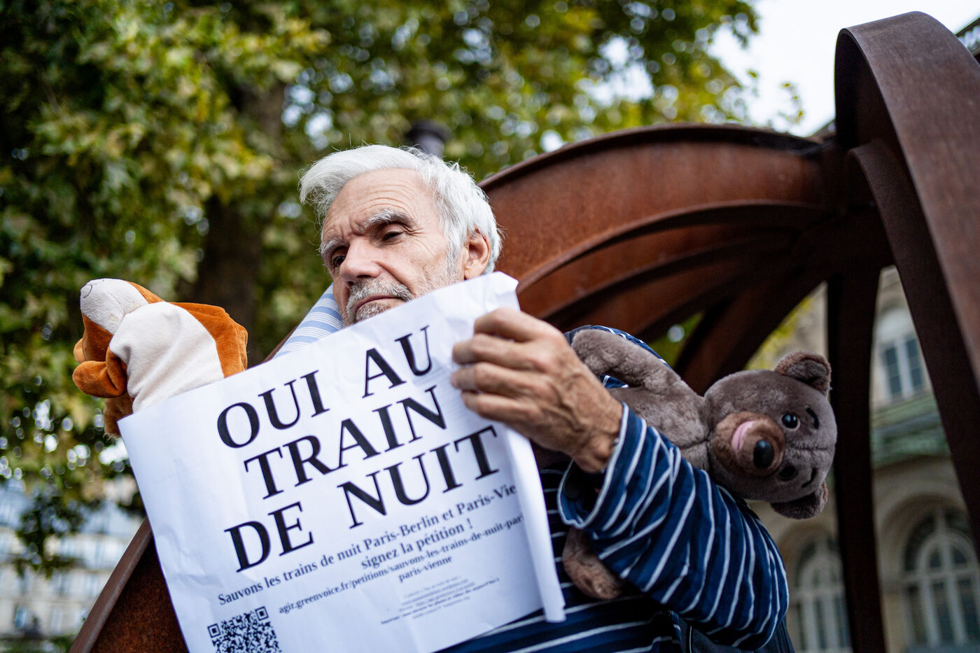 Manifestation sur le parvis de la Gare de l'Est sous forme d'un rassemblement pyjama party pour le maintien des trains de nuit, selon le collectif d'usagers "Oui au train de nuit", les trajets Paris-Vienne et Paris-Berlin nocturnes pourraient disparaître faute d'une subvention de l'Etat à Paris, France le 26 Septembre 2025.