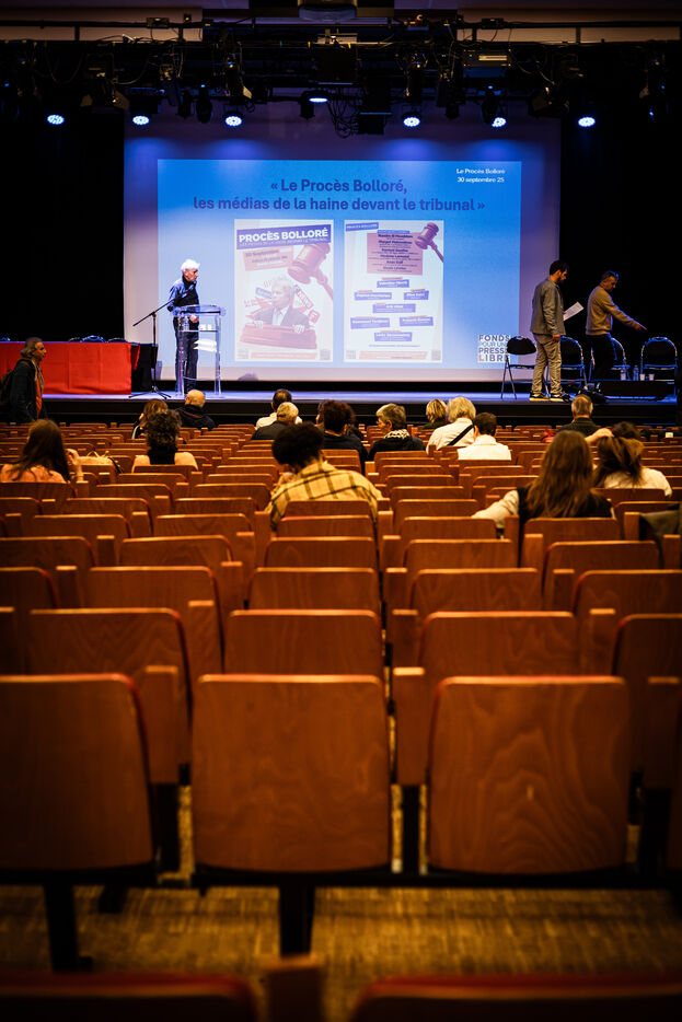 Event: ‘The Bollore Trial: Hate Media in Court,’ a symbolic mock trial organised by Le Fonds pour une Presse Libre (Fund for a Free Press, promoting a free and independent press), in the form of a public meeting at Espace Reuilly in Paris, France on September 30, 2025. Testimonies from FLP award-winning journalists on the behind-the-scenes of their investigations into the far right, its galaxy and its relays, followed by a staged court hearing based on unprecedented charges against the far-right ideas propagated by the Bollore group's media outlets (C8, CNEWS, Europe 1, Le Journal du Dimanche - JDD, etc.).