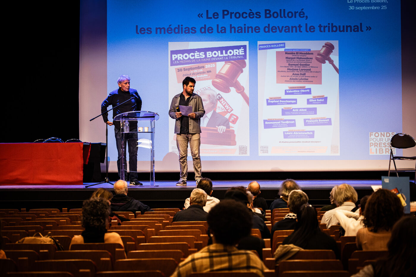 Évènement "Procès Bolloré, les médias de la haine devant le tribunal", procès symbolique parodique organisé par Le Fonds pour une Presse Libre (pour une presse libre et indépendante), sous la forme d'une réunion publique à l'Espace Reuilly à Paris, France le 30 Septembre 2025. Témoignages de journalistes lauréats du FLP sur les coulisses de leurs enquêtes sur l’extrême-droite, sa galaxie et ses relais, puis mise en scène d'une audience judiciaire à partir de chefs d’accusation inédits contre les idées d'extrême droite propagées par les médias du groupe Bolloré (C8, CNEWS, Europe 1, Le Journal du Dimanche - JDD, etc).