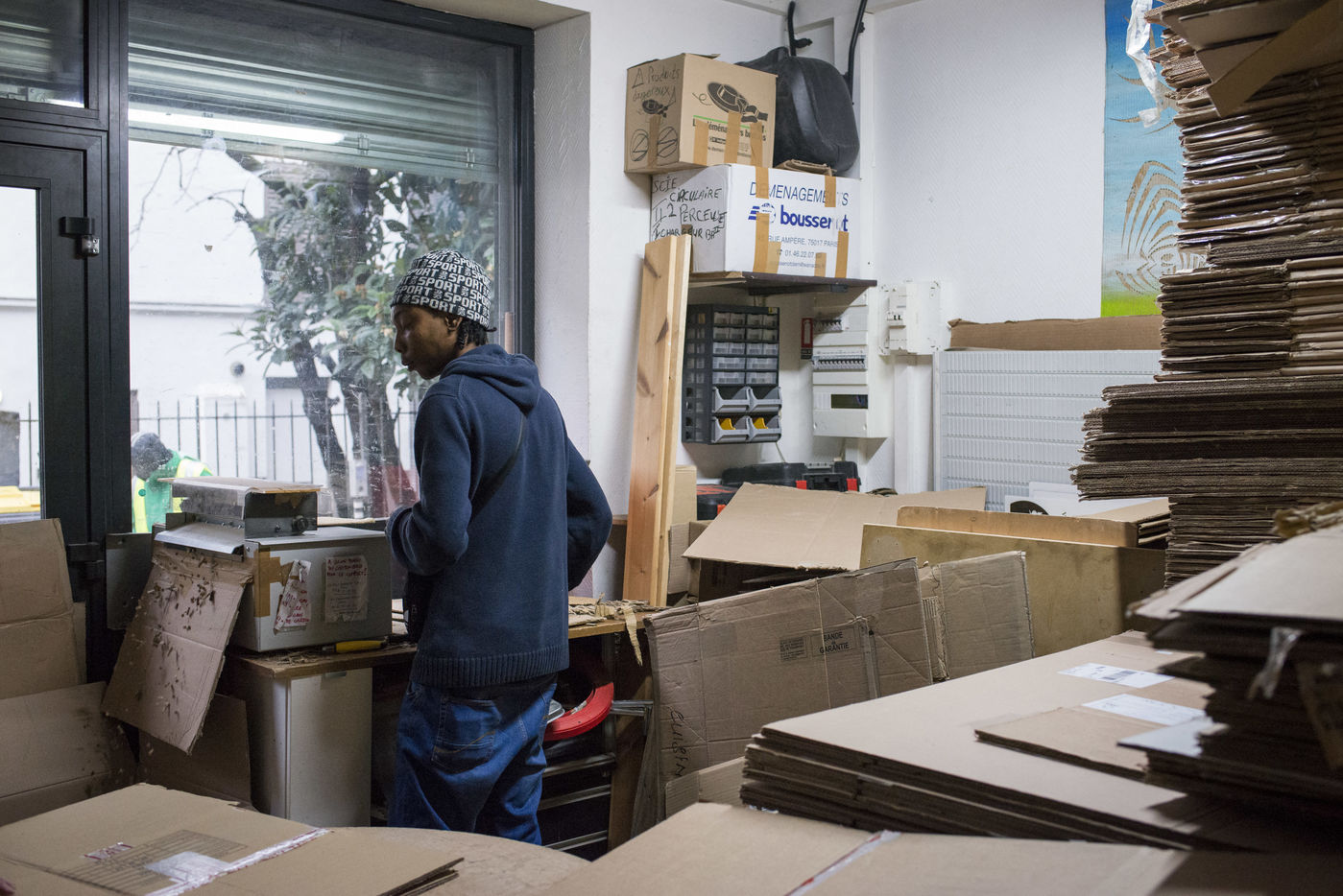 Après une courte pause déjeuner, les valoristes du matin laissent place à ceux de l'après-midi, dont Ayass, un jeune kurde irakien d'une trentaine d'années, arrivé en France il y a huit ans. Il a longtemps dormi à la rue, mais avec l'obtention de ses papiers il y a six mois, les choses se sont un peu débloquées et il est désormais à l'abri. Deux jours par semaine il vient à Carton Plein et se rend disponible les autres jours pour déménager les parisiens.